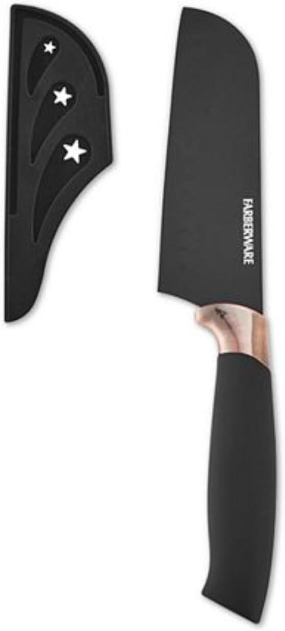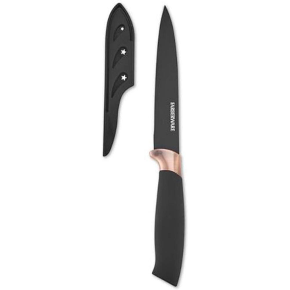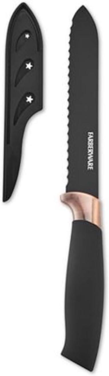 Ergonomically designed handle for comfort while cutting12pc black and copper cutlery setStick resistant blade; blade cover for secure storage while knife is not in useHandwash only