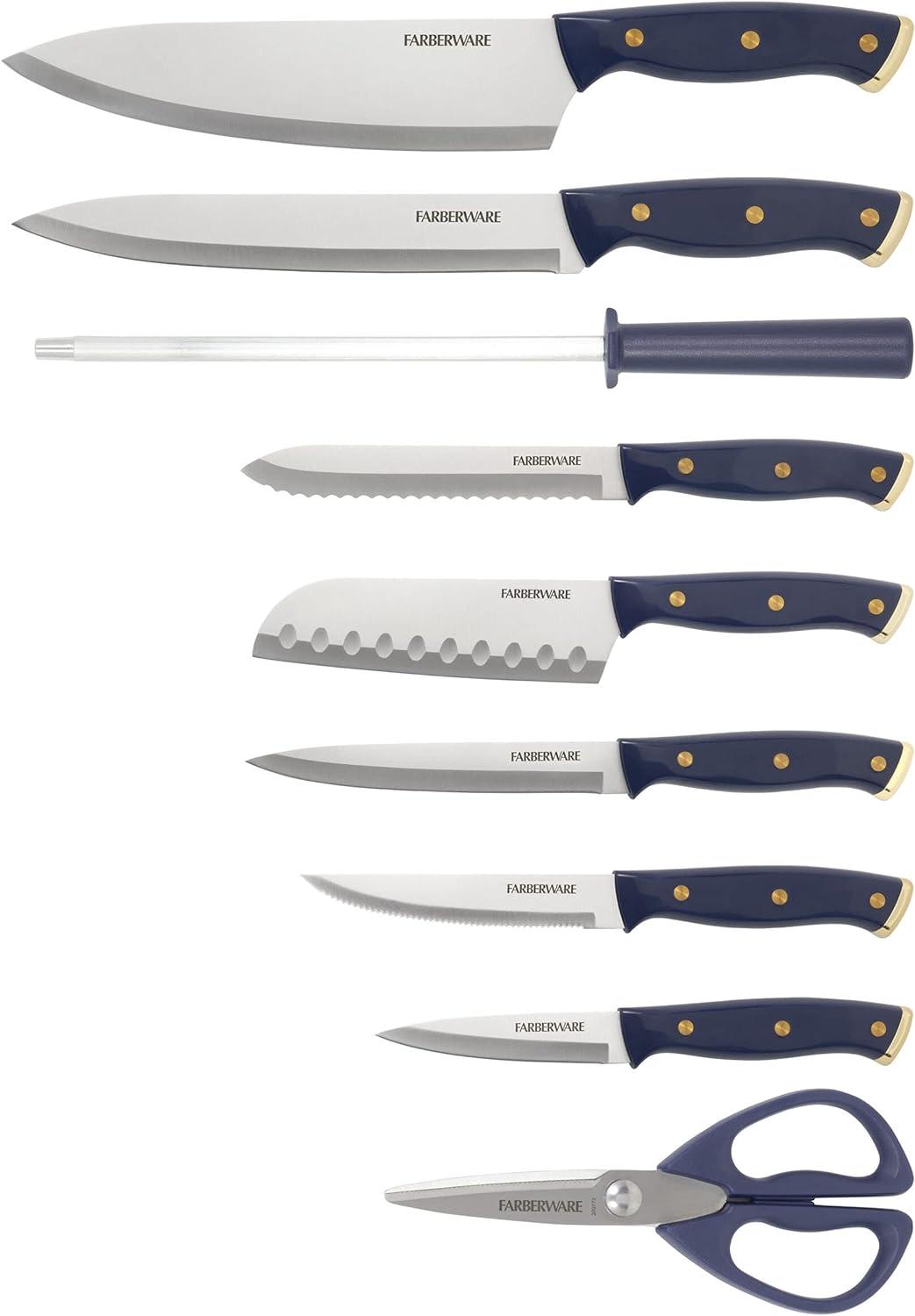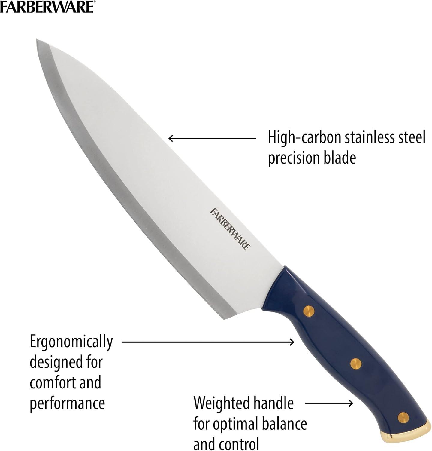 Farberware 14-Piece Knife Block Set, White and Gold – Razor-Sharp, High-Carbon Stainless Steel, Triple-Riveted, Ergonomic Handles, Stylish Wood Block(Navy and Gold)