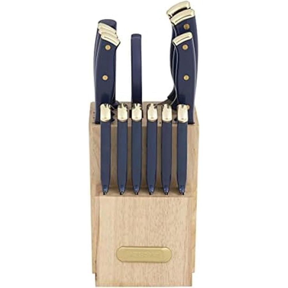 imageFarberware 14Piece Knife Block Set White and Gold  RazorSharp HighCarbon Stainless Steel TripleRiveted Ergonomic Handles Stylish Wood BlockNavy and Gold