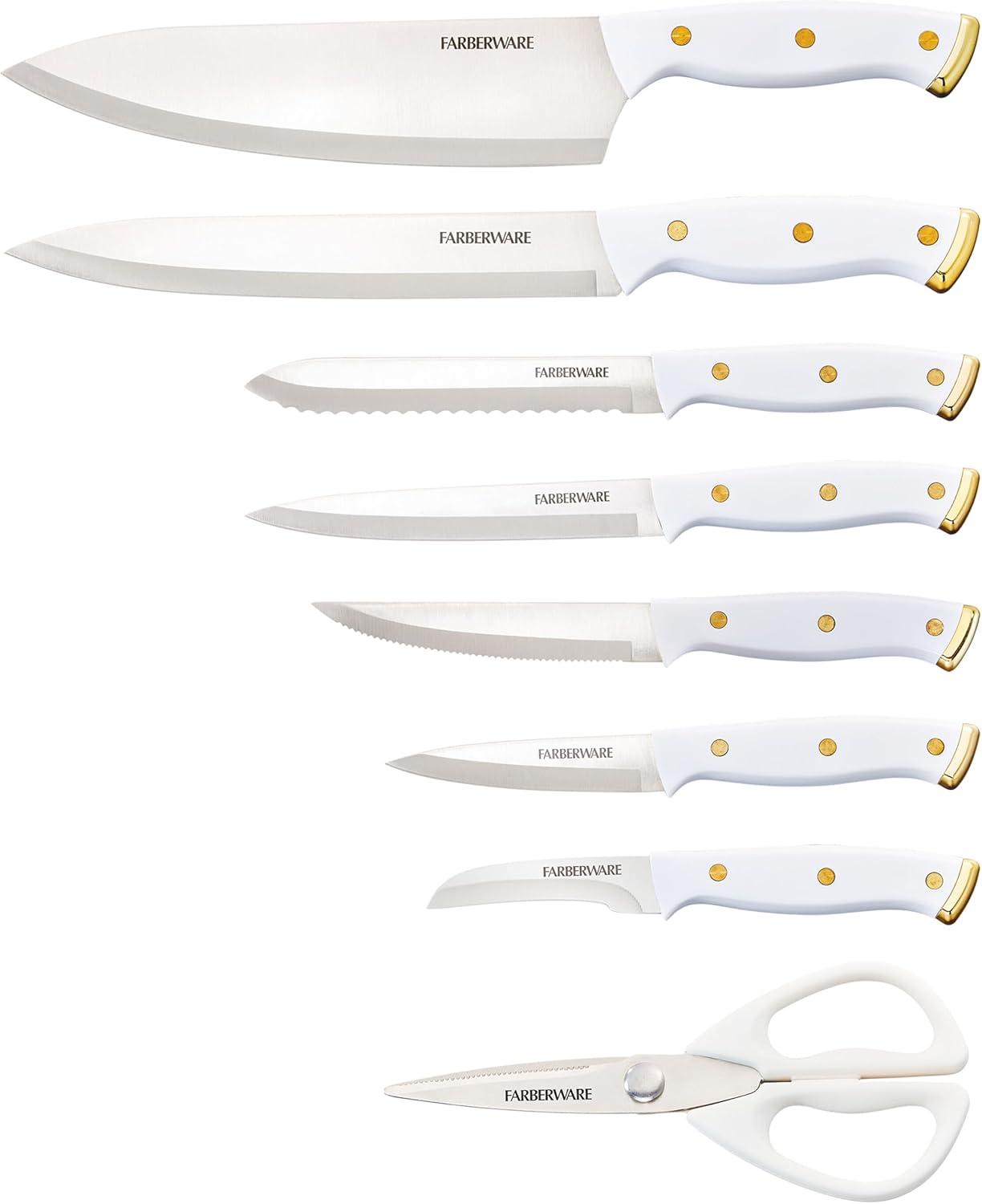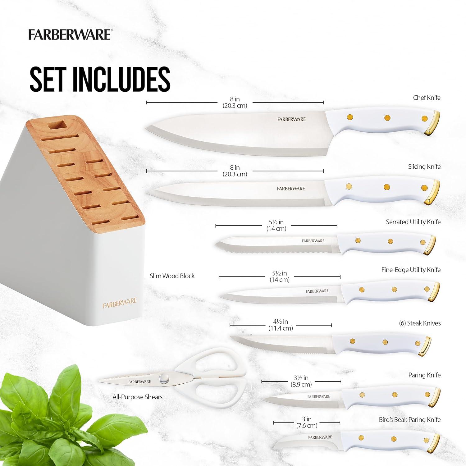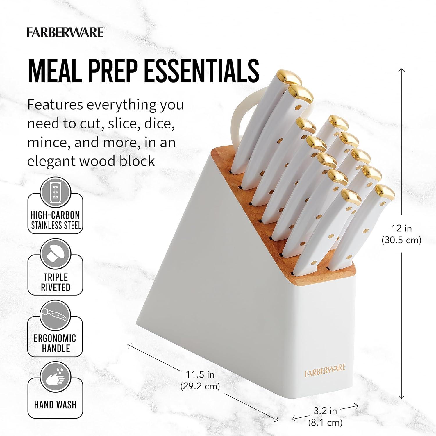 Farberware 14-Piece Knife Block Set, White and Gold – Razor-Sharp, High-Carbon Stainless Steel, Triple-Riveted, Ergonomic Handles, Stylish Wood Block(White and Gold)