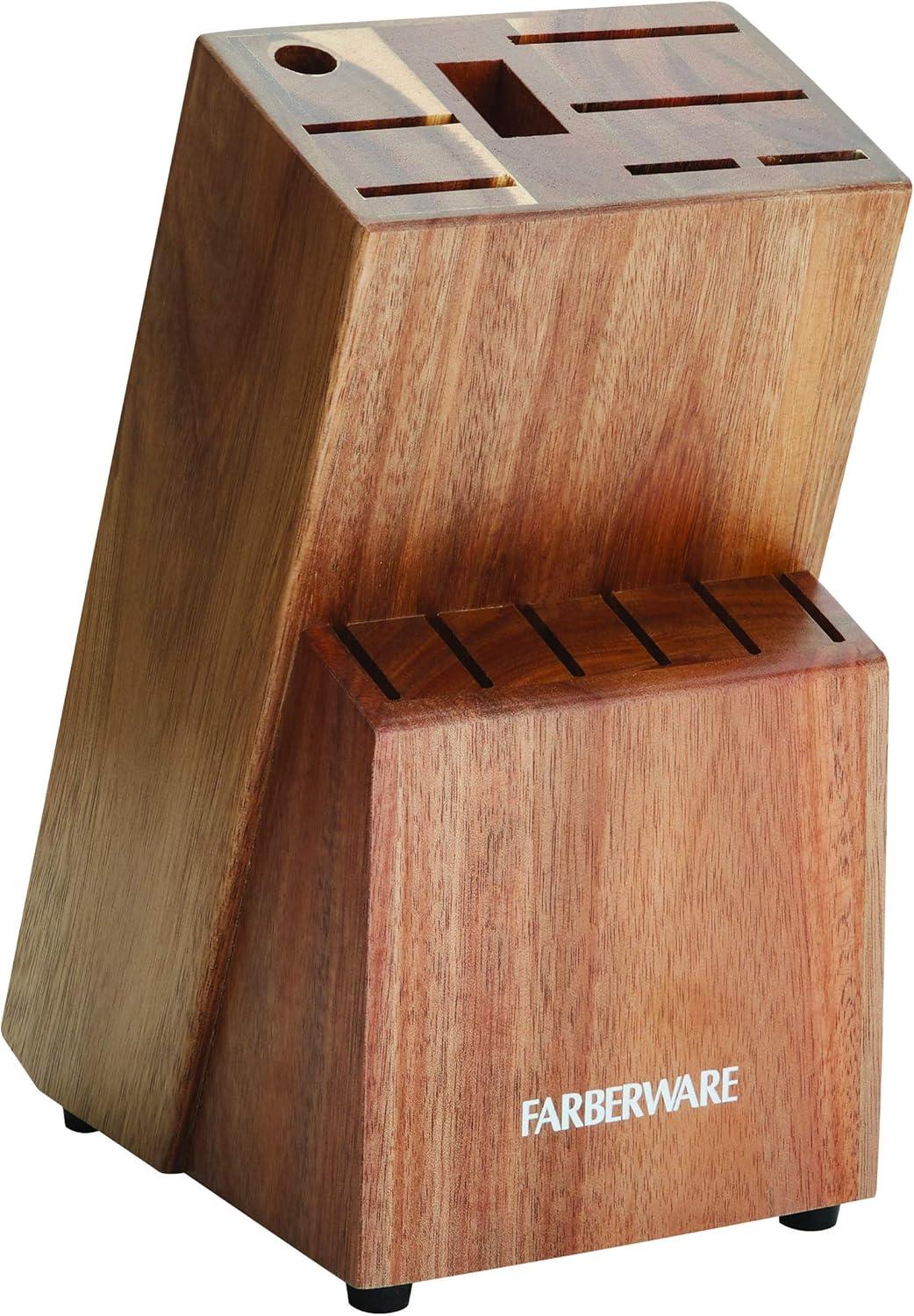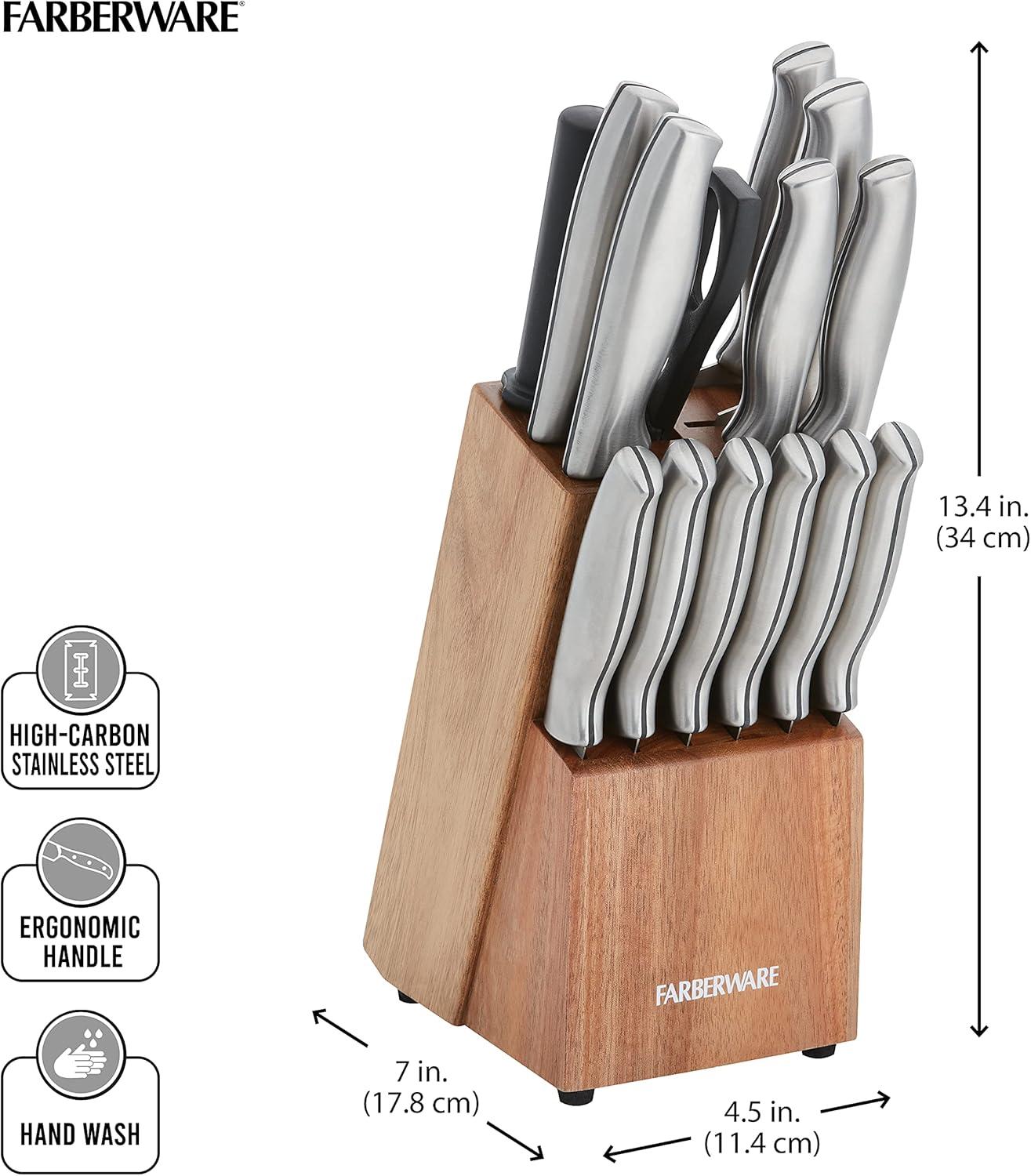 FARBERWARE 15-Piece Kitchen Knife Set with High-Carbon Stainless Steel Blades, Black Handles, Steak Knives, Wood Block, Razor Sharp and Ergonomic(Acacia Wood)
