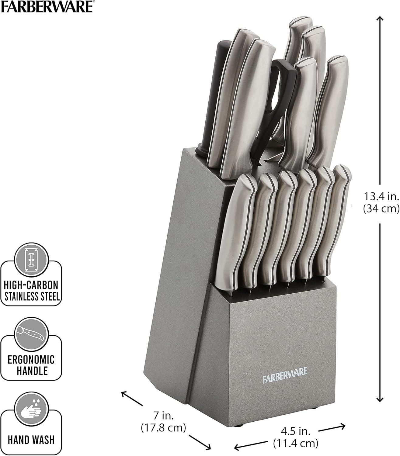 FARBERWARE 15-Piece Kitchen Knife Set with High-Carbon Stainless Steel Blades, Black Handles, Steak Knives, Wood Block, Razor Sharp and Ergonomic(Graphite)