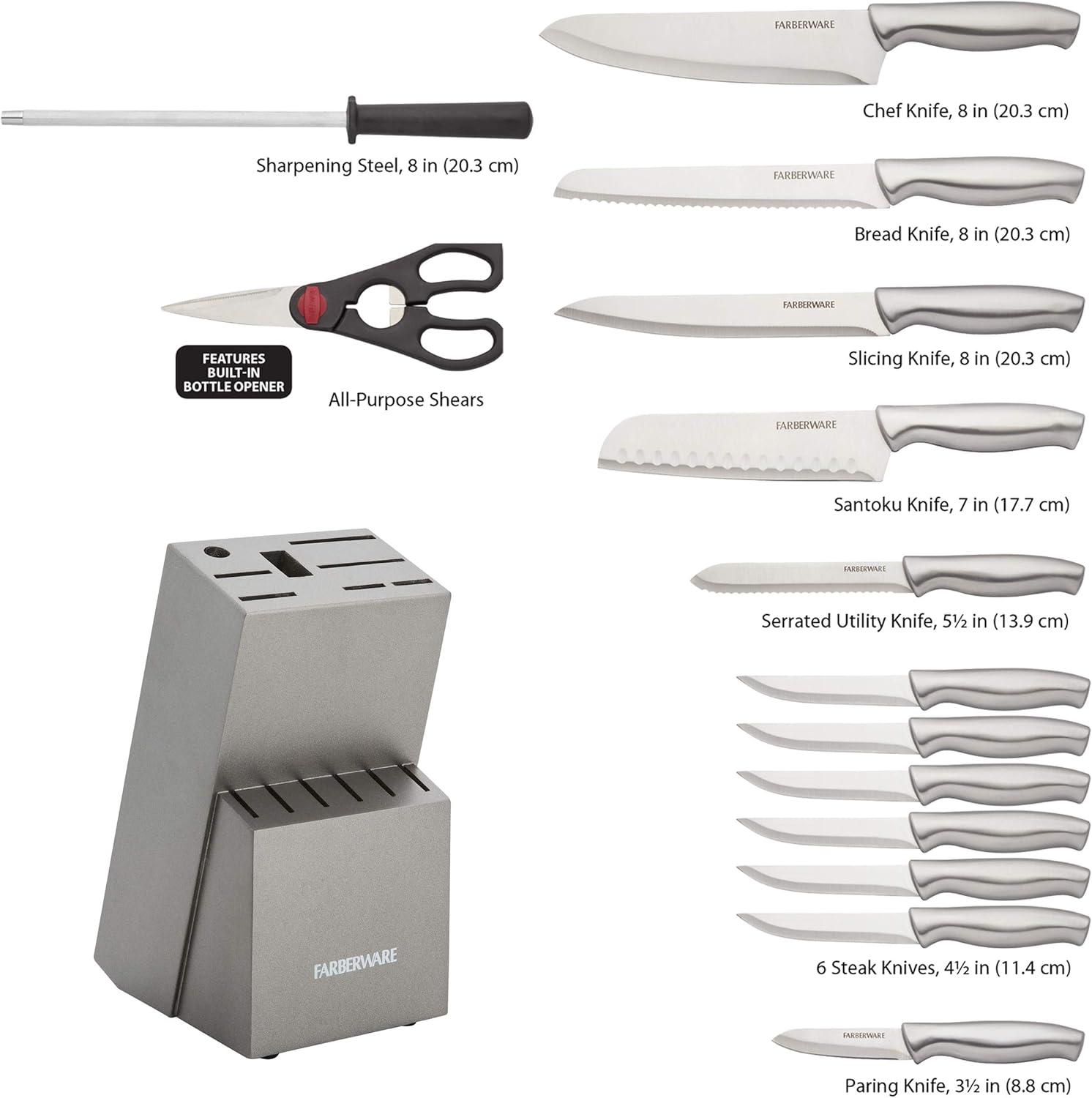 imageFARBERWARE 15Piece Kitchen Knife Set with HighCarbon Stainless Steel Blades Black Handles Steak Knives Wood Block Razor Sharp and ErgonomicNatural Bamboo