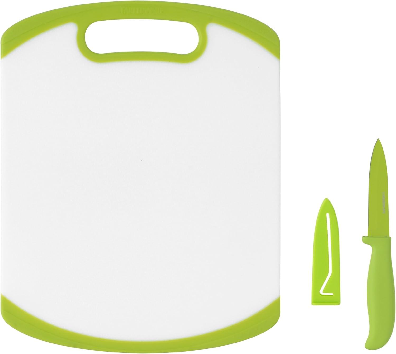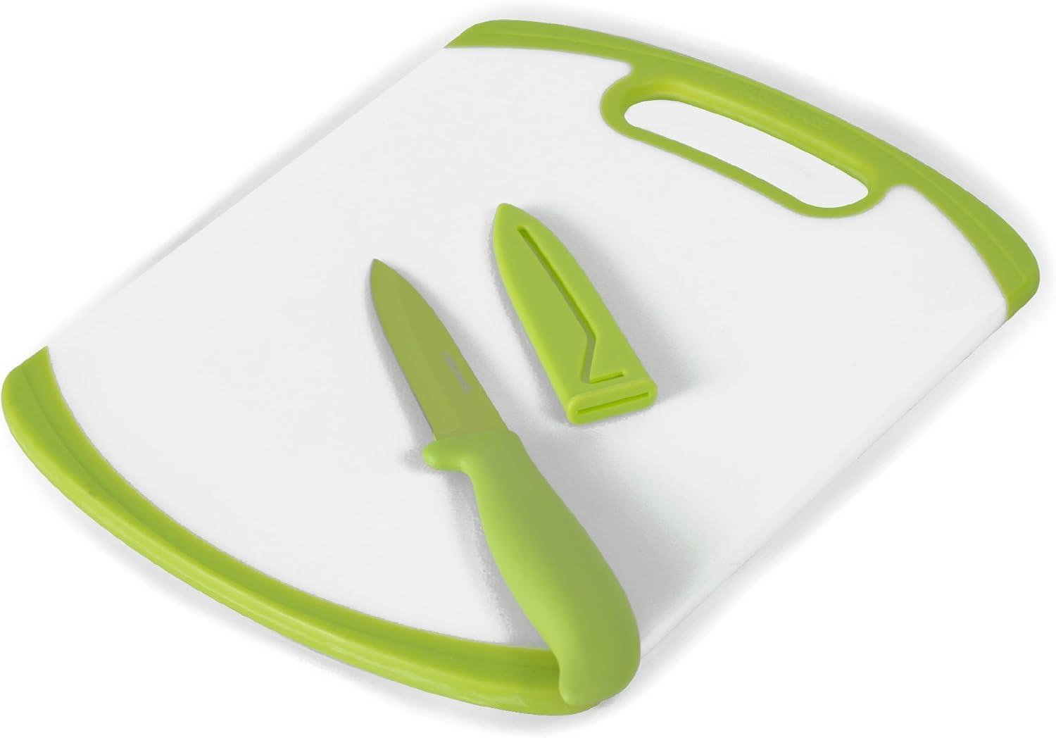 This set includes an 8-inch-by-10-inch non-slip plastic cutting board with a 3.5-Inch paring knife and sheath