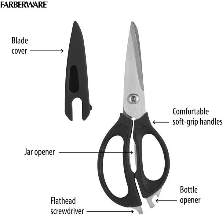 Always have the right household tools on hand with these Farberware Aqua and Grey 4in1 Scissors. This pair of kitchen scissors eliminates the needs for multiple tools in the kitchen and saves precious drawer space. 4-in-1 design includes a scissors, jar opener, flathead screwdriver, and bottle opener. Features a high-carbon, stainless steel blade which ensure the shear retains its ultra-sharp edge for a variety of kitchen and household needs. The handles are ergonomically designed and feature a soft grip for comfort while cutting. Includes: 4in1 Scissors with sheath, built-in bottle opener, screwdriver, and lid lifter. Scissors are not dishwasher safe. Hand wash with warm water and a mild detergent; rise and dry immediately.