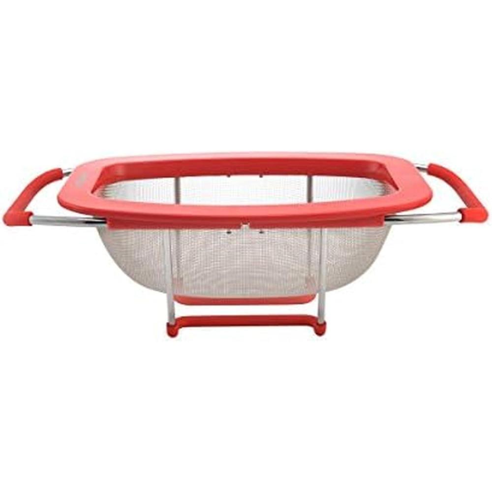 This Farberware Professional Red Expandable Colander is an essential kitchen tool. Place it over your sink to drain pasta and rinse fruits and vegetables. The soft, expandable arms fully extend to 22 inches, so it’s a great fit for most kitchen sinks, and the nonslip feet help keep the colander in place when in use. Made of stainless steel and plastic. Measures 10 inches wide and 5 inches high. Top rack dishwasher safe..