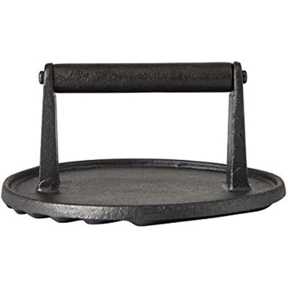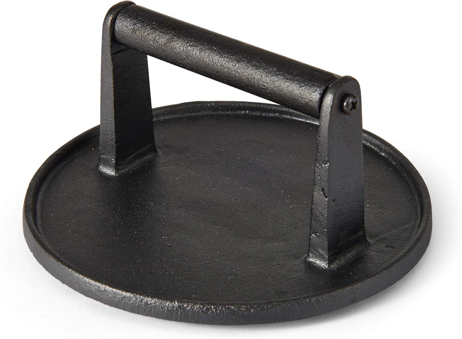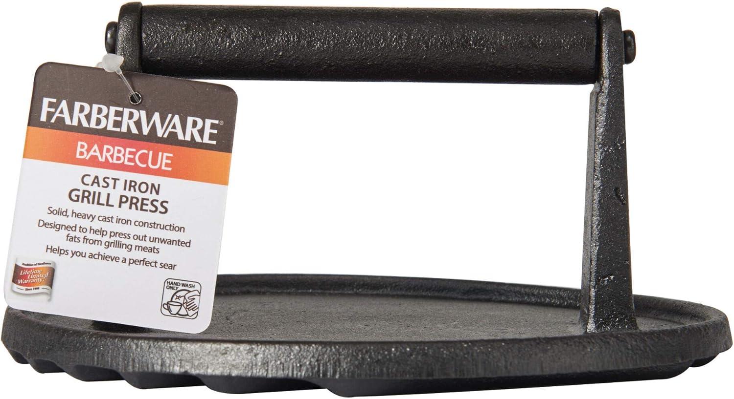Easily press excess fats from meats while grilling with this Farberware BBQ Grill Press. Made of solid, heavy cast iron to tackle even thick cuts of meat, this grill press has a smooth surface and durable handle, making it easy to press out unwanted fats while grilling meats to give them a perfect sear. Measures 7 x 7 x 3-1/4 inches. Hand-wash with warm water and a mild detergent then rinse and dry.