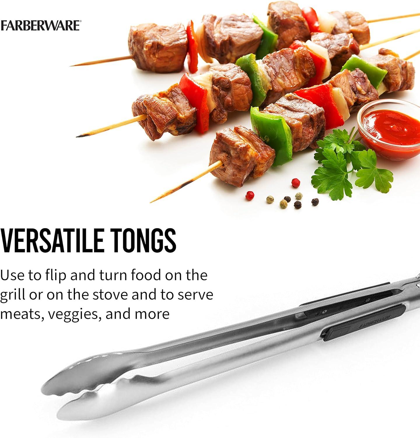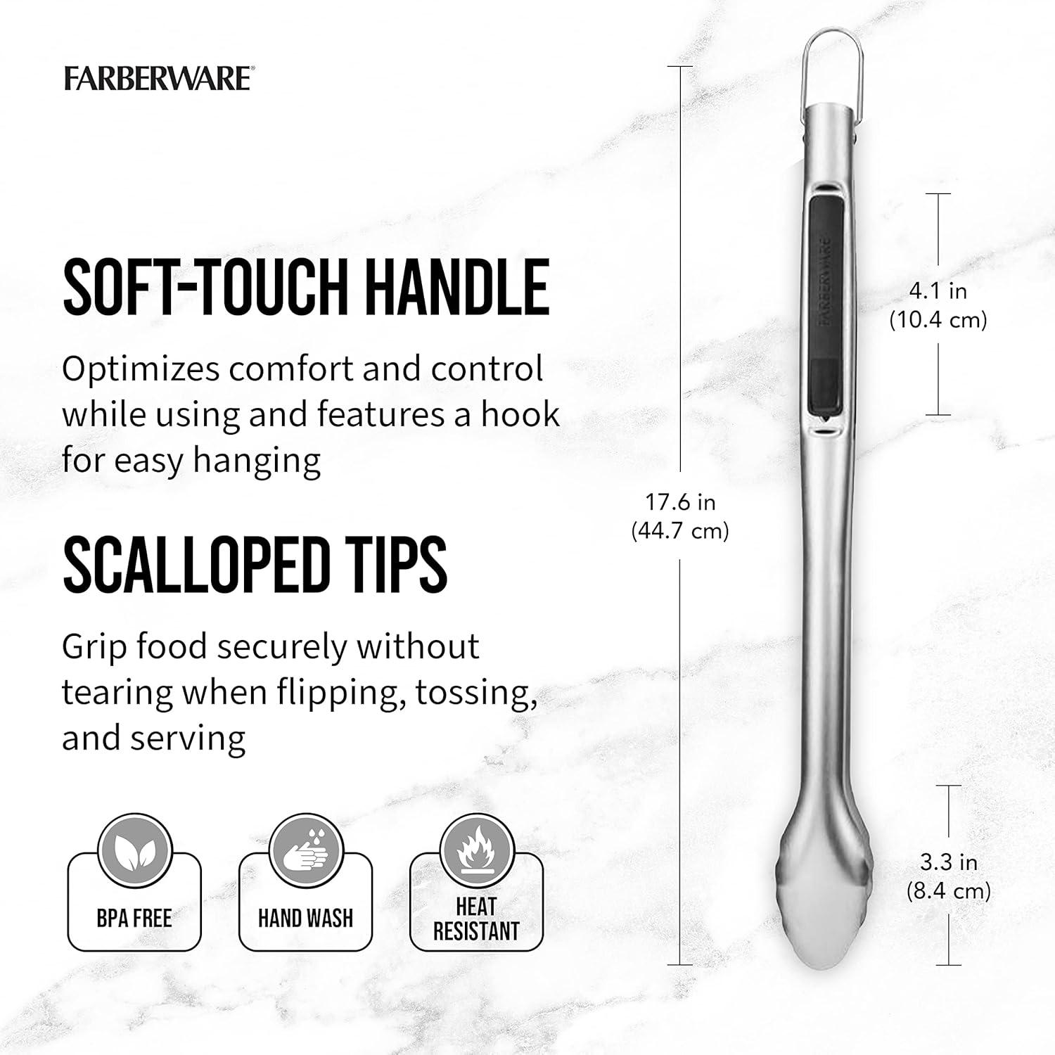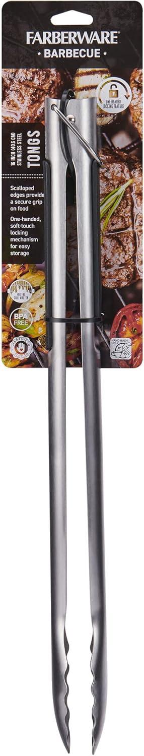 Farberware BBQ Stainless Steel Tongs feature scalloped edges for an improved grip on food. They also include an easy-lock feature, which secures the tongs for easy storage. Black silicone accents on the handles provide a secure, comfortable grip. Measures 15-3/4 inches. Dishwasher safe.