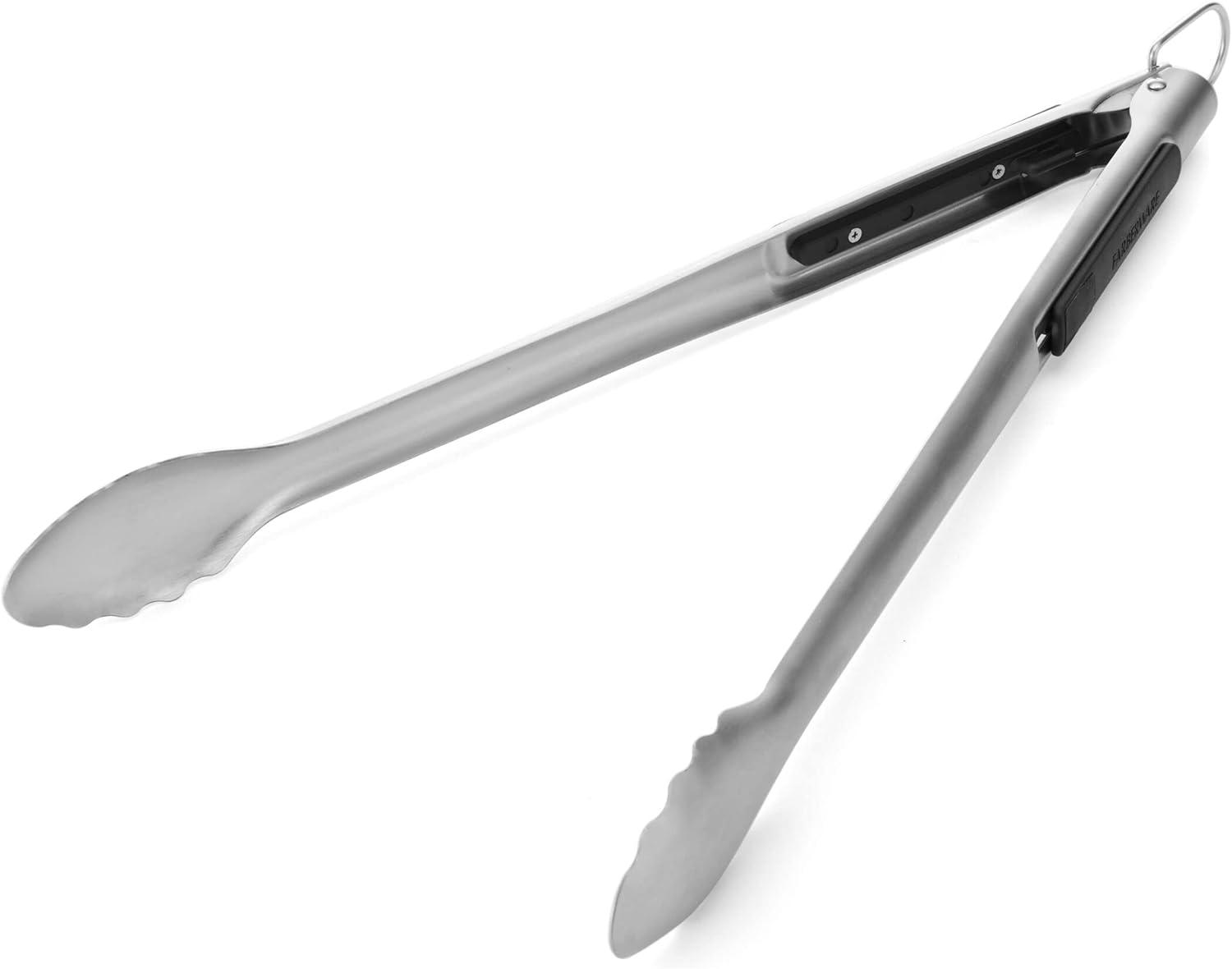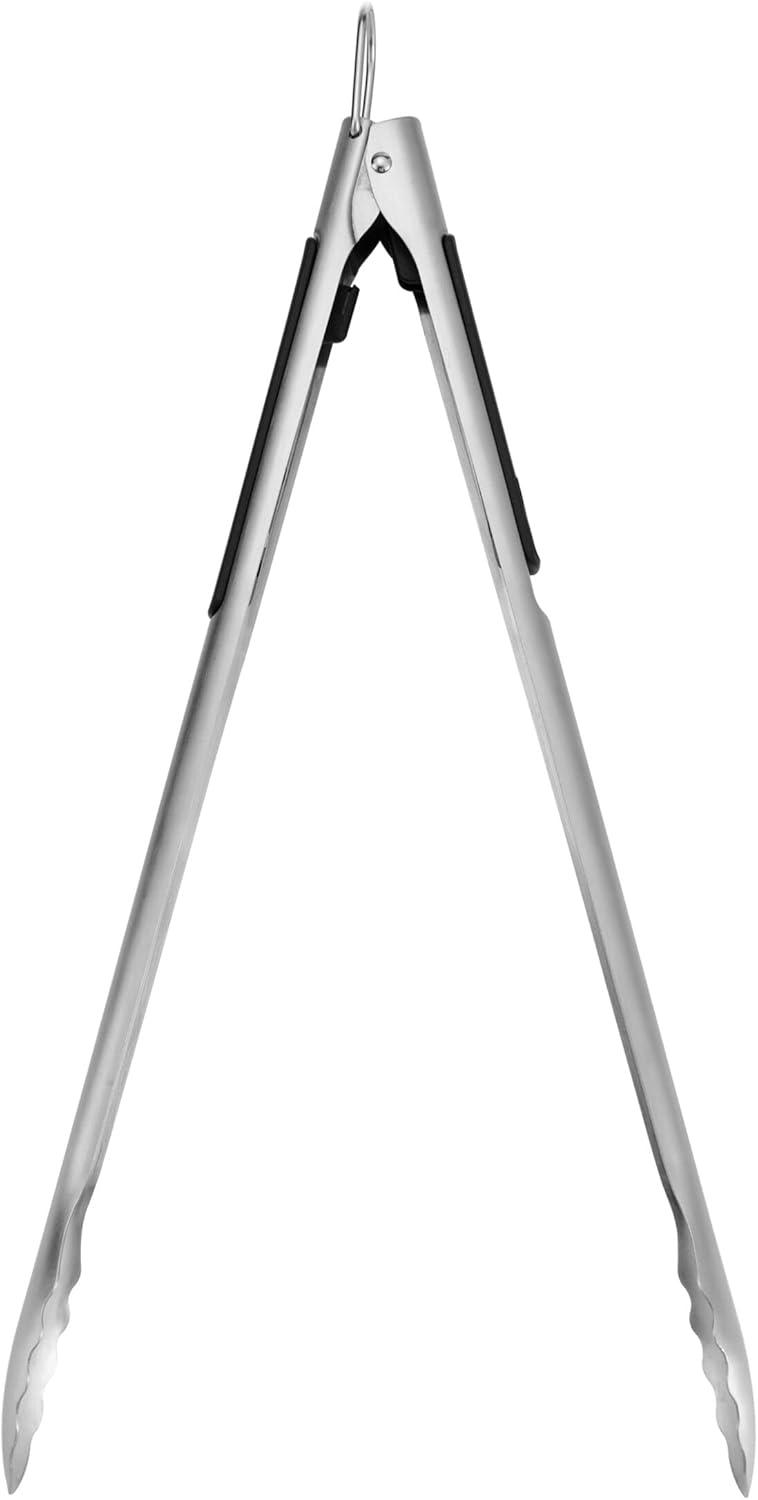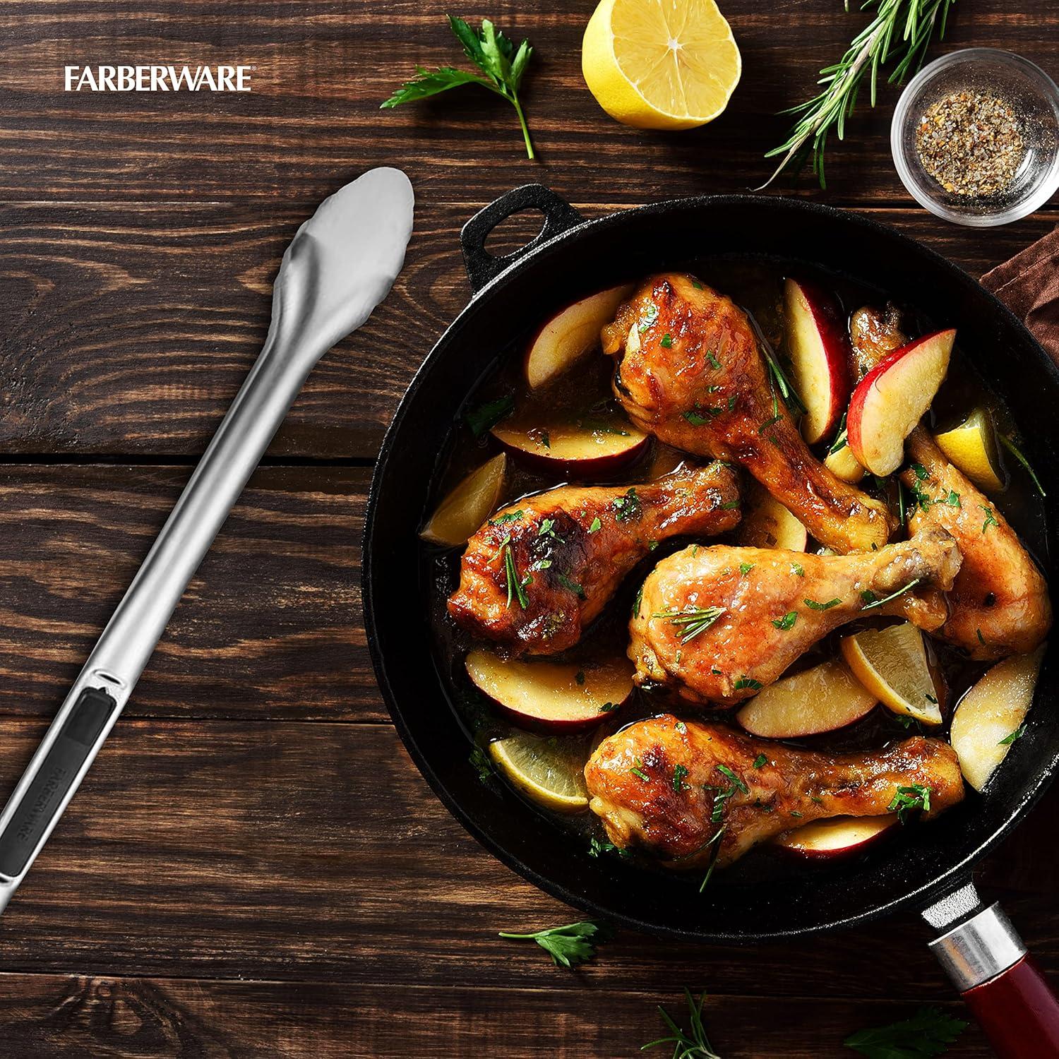 Farberware BBQ Stainless Steel Tongs feature scalloped edges for an improved grip on food. They also include an easy-lock feature, which secures the tongs for easy storage. Black silicone accents on the handles provide a secure, comfortable grip. Measures 15-3/4 inches. Dishwasher safe.