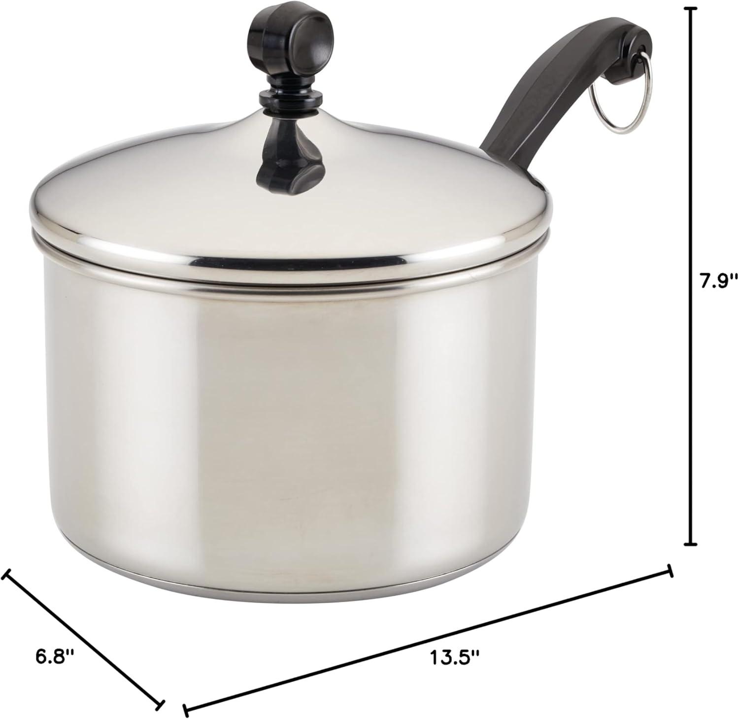 This Farberware Classic Series 2-Quart Stainless Steel Saucepan with Lid is sure to come in handy at all times of the day or night. Farberware has been trusted for over 100 years, and this saucepan continues that tradition for a new generation. A full cap base featuring a thick aluminum core surrounded by stainless steel provides rapid, even heating, perfect when cooking oatmeal or poaching an egg or two at breakfast. The heavy-duty stainless steel is polished to a mirror finish for a classic touch, and the comfortable saucepan handle with iconic styling provides a confident grasp. This 2-quart saucepan works beautifully when reheating a serving of macaroni and cheese at lunch, cooking a side of rice during dinner, or warming chocolate sauce to top off an ice cream sundae for dessert. A self-basting lid helps seal in heat and flavor and the saucepan is dishwasher safe and oven safe to 350°F, making it a perfect complement to the rest of the Farberware collections. Rely on the versatile, dependable Farberware Classic Series 2-Quart Stainless Steel Saucepan with Lid for everything from reheating leftovers to helping make dessert.