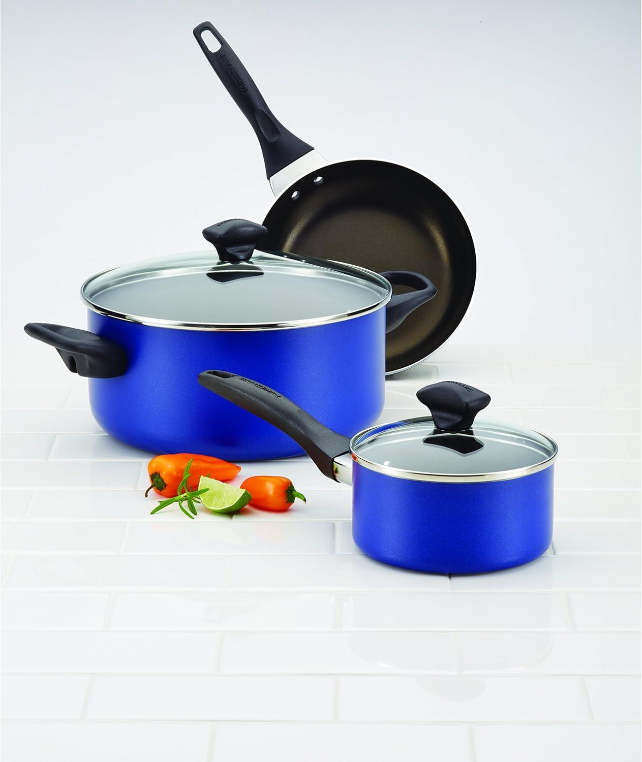 PREMIUM NONSTICK COOKWARE AND BAKEWARE: Top-quality nonstick interiors release foods easily for fast cleanup; pots and pans are dishwasher safe for even more convenience