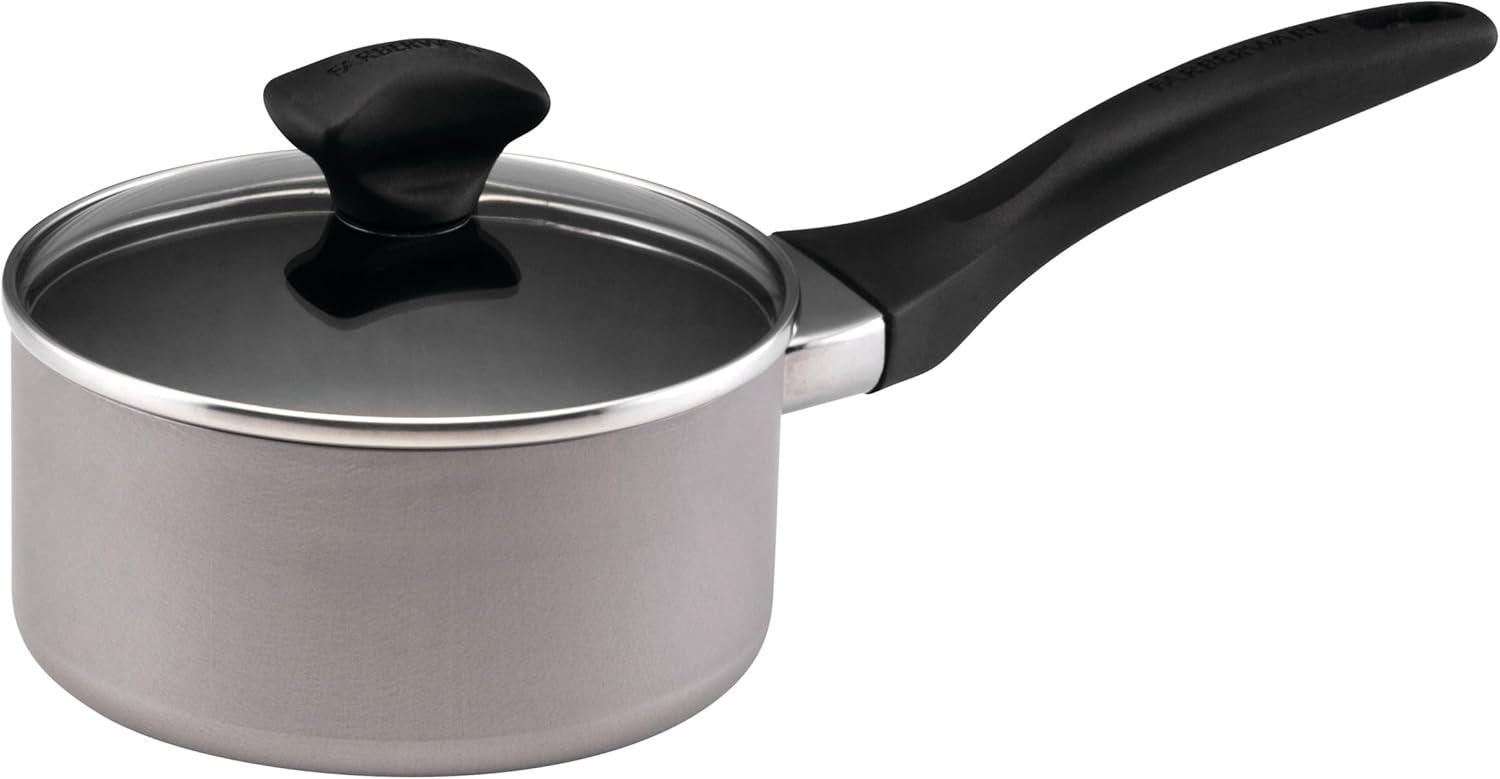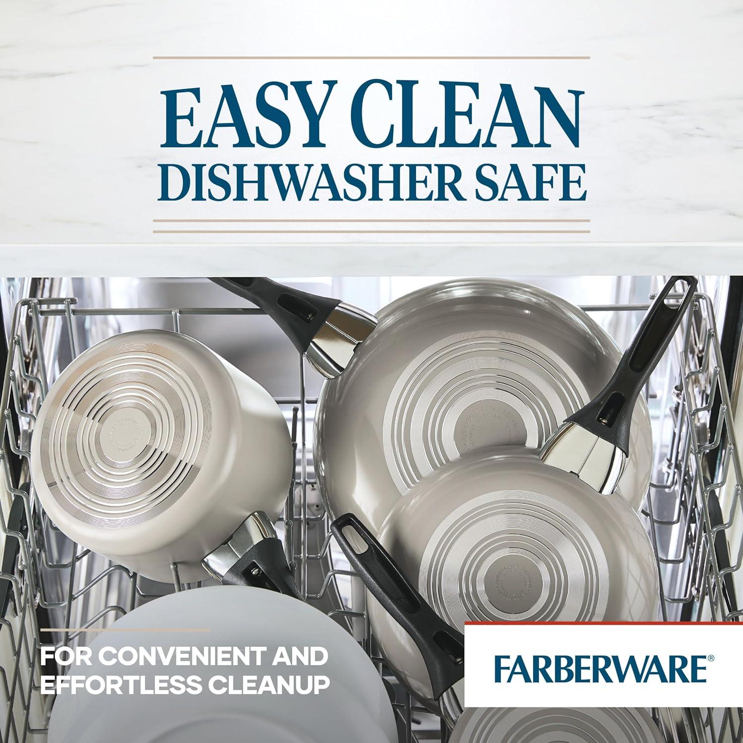 Farberware provides classic quality and dependability cooks have relied on since 1900, with modern styling for today. This Farberware Dishwasher Safe Nonstick 15-Piece Cookware Set is constructed from sturdy aluminum that heats quickly and evenly to help reduce hot spots that can burn food. Long-lasting, top-quality nonstick coats the pots and pans for excellent food release, while the sleek cookware exteriors add a touch of style to any type of kitchen décor. Shatter-resistant glass lids feature easy-to-grasp knobs while allowing cooking to be watched without heat and moisture loss, and the double-riveted handles provide a strong grip. Oven safe to 350° F, as well as dishwasher safe, this nonstick cookware set comes with five nylon Prestige(r) cooking utensils ideal for nonstick surfaces. And don’t forget dessert – bake delicious bar, rolled or drop cookies to perfection on the medium cookie sheet, which is oven safe to 450° F. Get any kitchen started in quality and style with the Farberware Dishwasher Safe Nonstick 15-Piece Cookware Set, and leave cleanup to the dishwashing machine.