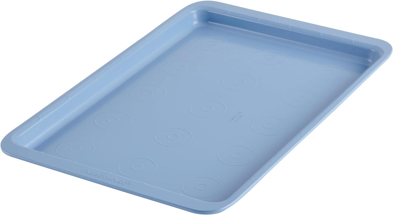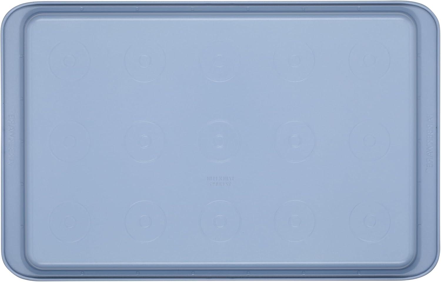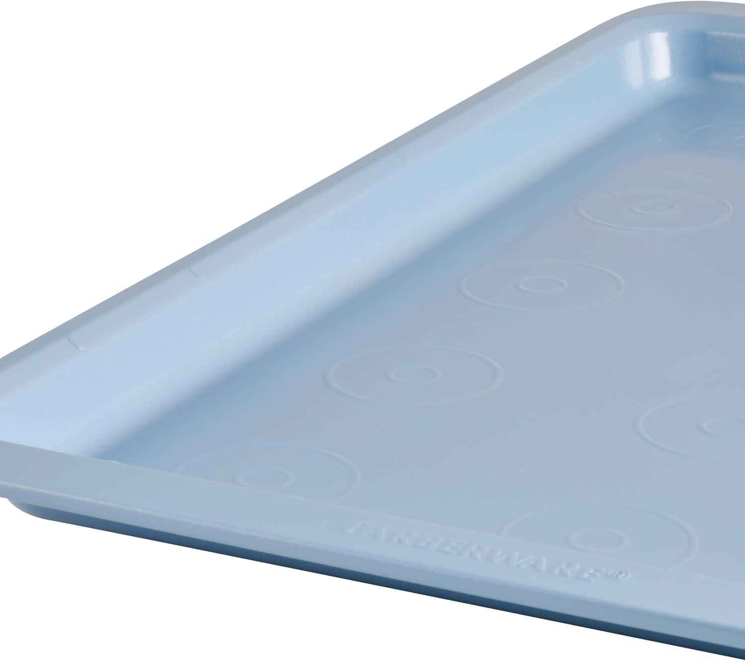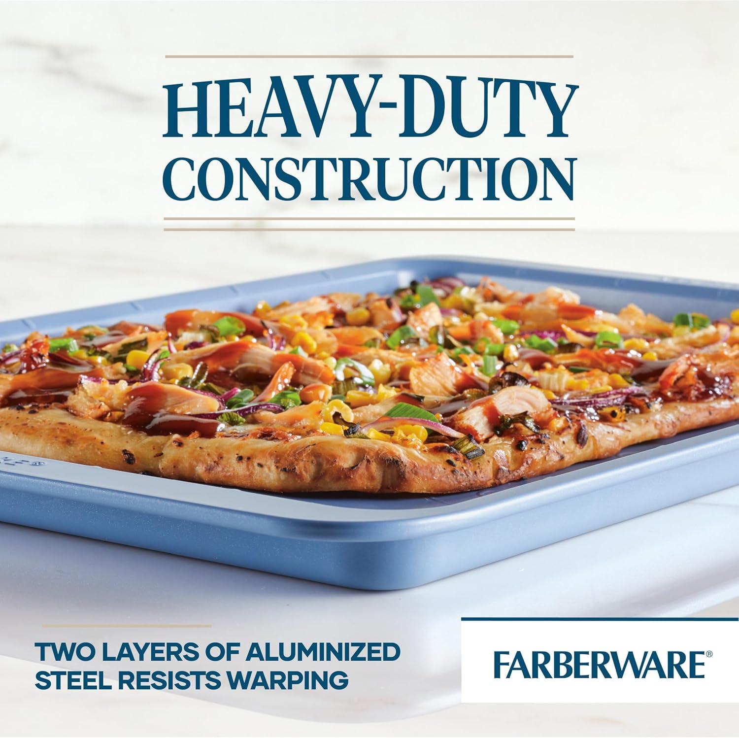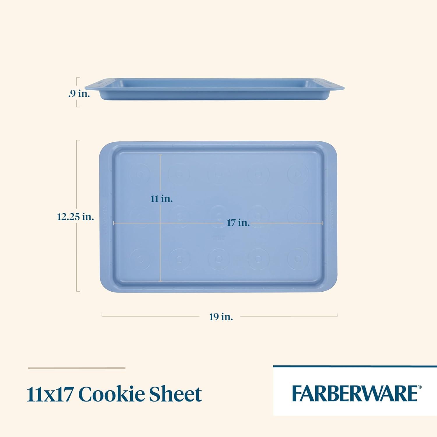 Feel confident baking anything and everything with this 11″ x 17″ nonstick baking sheet from Farberware Easy Solutions. Designed for convenient, easy baking, Farberware Easy Solutions sheet pans boast a sturdy, heavy-duty steel construction which resists warping, and has two layers of smooth, durable, easy-release nonstick. Unique features include cookie outlines on the pan — that show you just where to plop down your dough — and lines to help guide cutting into equal portions. The wide, full-length handles make it a breeze to move batches from stove to oven to cooling rack, and the bake pans are dishwasher safe for quick, convenient cleanup. Oven safe up to 450°F to take on a wide variety of recipes.