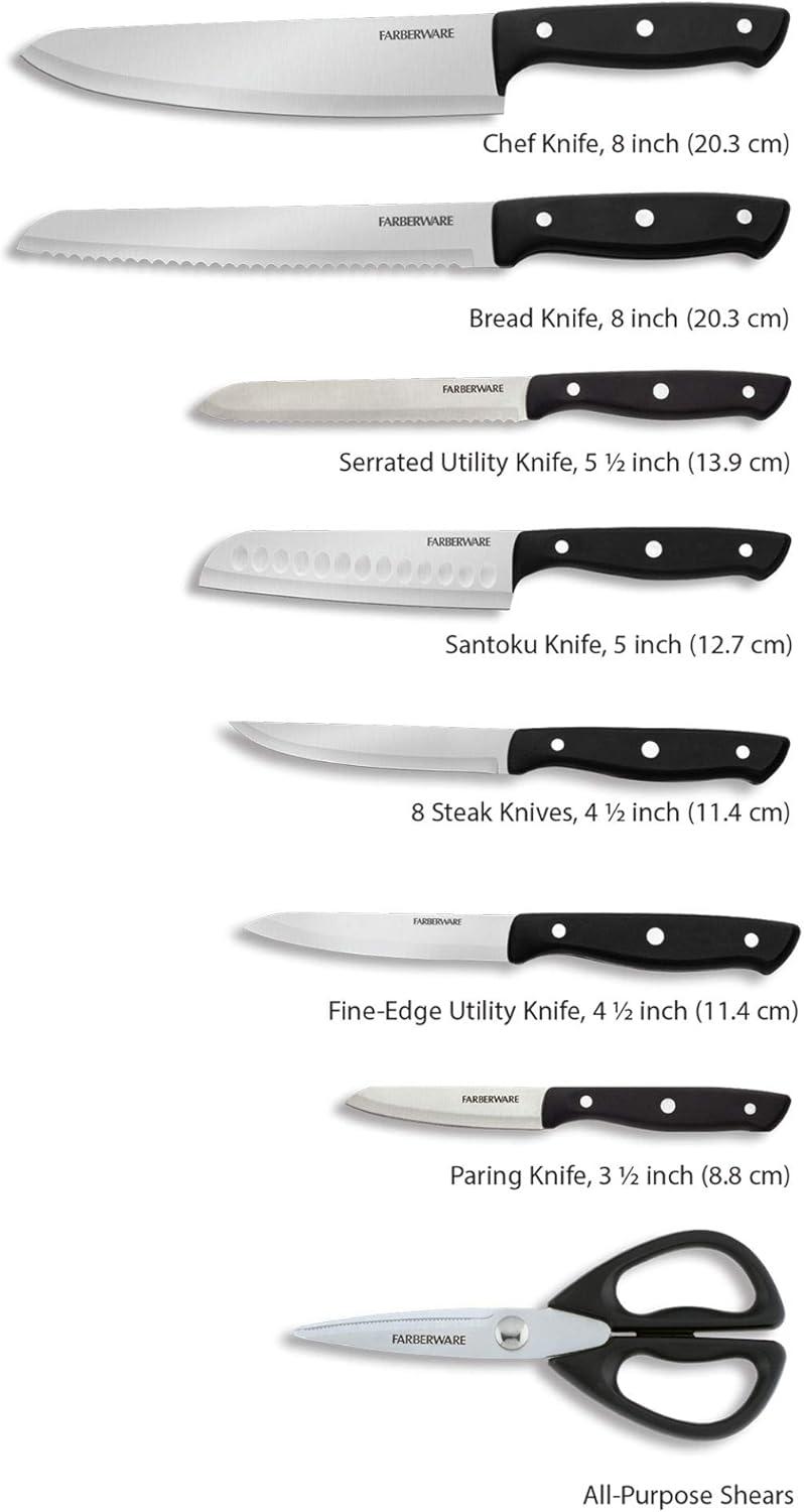 This Farberware 16-Piece, Stainless Steel Handle Cutlery Set is a sleek addition to a modern kitchen, and includes all the essential knives for everyday food prep tasks. These knives feature high-carbon, stainless steel blades for strength and durability. The stainless steel handles feature a full tang and are ergonomically designed for comfort in the hand. All pieces stay neat, organized, and easily within reach in the countertop wood storage block that includes the Edgekeeper Universal built in sharpener. This innovative block features a universal sharpener slot that allows you to easily sharpen knives. Simply insert the knife into the slot and glide through the ceramic sharpening rods. This set includes an 8 inch chef knife, 8 inch bread knife, 5.5 inch serrated utility knife, 5 inch Santoku knife, 4.5 inch fine edge utility knife, 3.5 inch paring knife, (8) 4.5 inch steak knives, all purpose shears, and a storage block with built in fine edge knife sharpener. Hand Wash with Warm Water and a Mild Detergent; Towel Dry Immediately; Do Not Wash in Dishwasher or Allow to Soak.