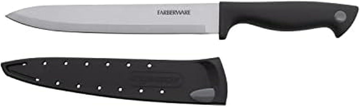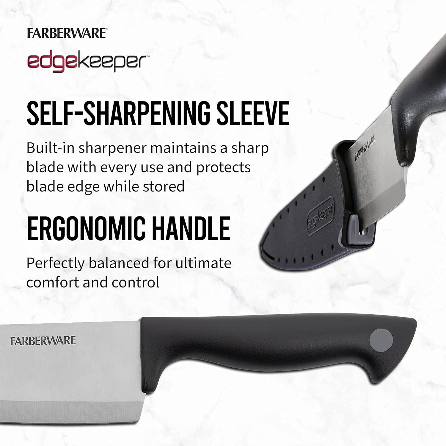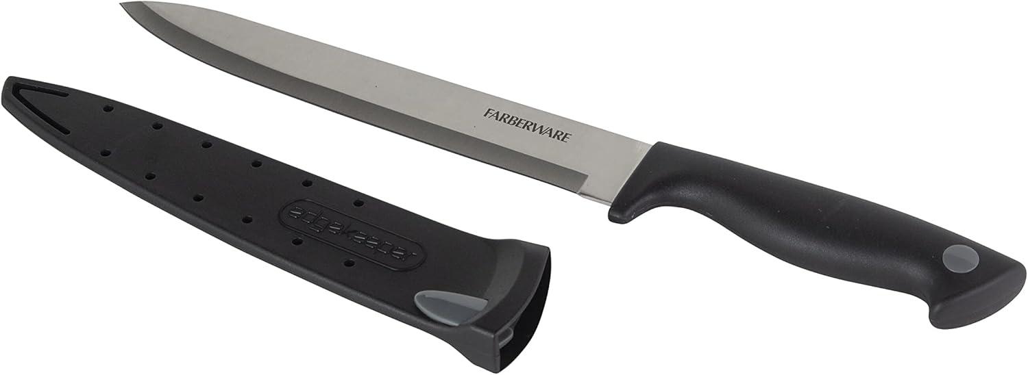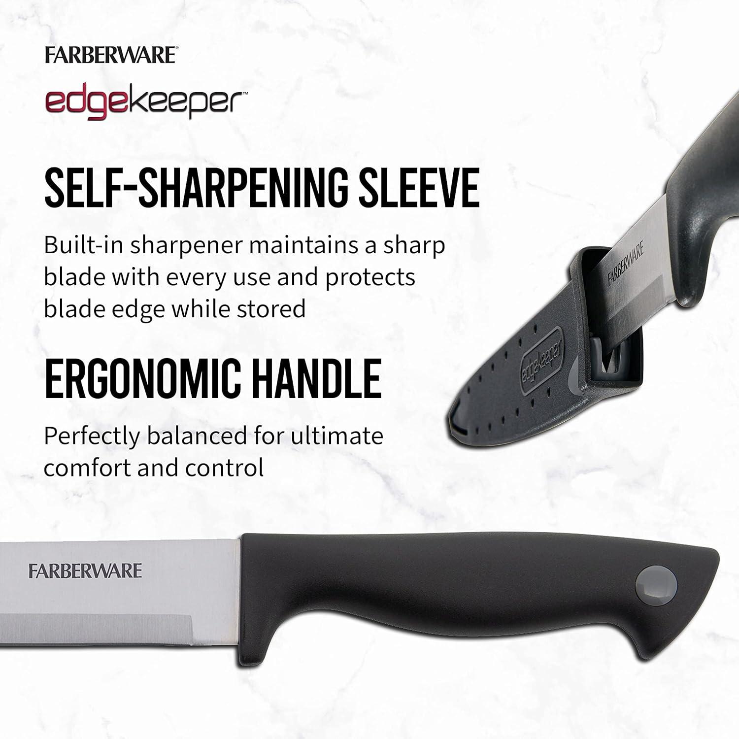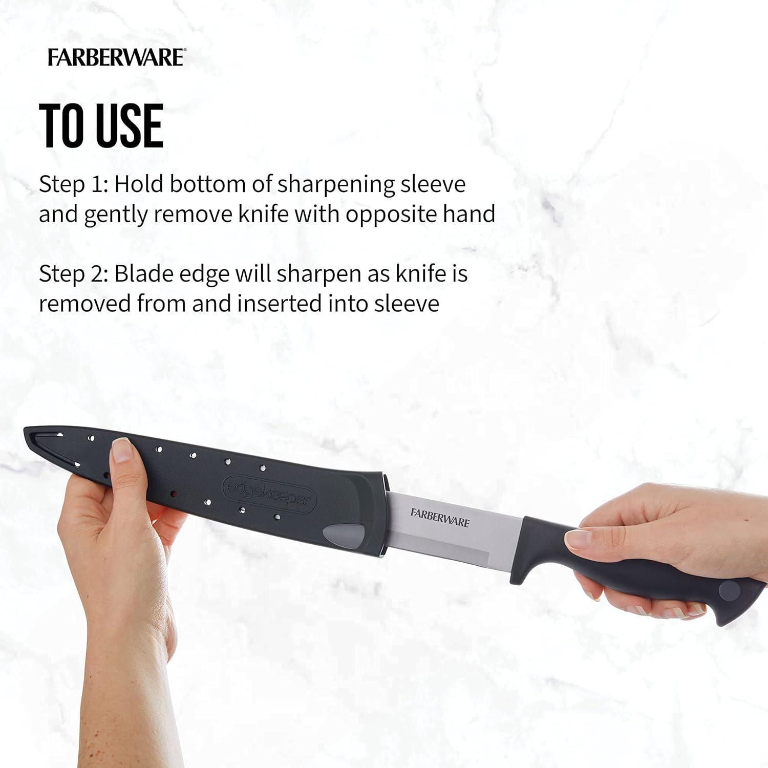This Farberware 8-inch Slicing Knife with self-sharpening blade cover is essential for your everyday food prep tasks. It features a high-carbon stainless steel blade that cuts with higher precision. The ergonomically designed polypropylene handle is comfortable and balanced for precise cutting tasks. The Edgekeeper blade cover features a built-in sharpener designed to sharpen blade edges with every use. To Use: Hold the bottom of the sharpening sleeve and gently remove the knife with opposite hand. Blade edge will sharpen as knife is removed from the sleeve, as well as inserted into the sleeve. Includes: 8-inch slicing knife with self-sharpening blade cover. Hand wash with warm water and a mild detergent; rinse and dry immediately; wipe protective, blade cover as needed with a damp cloth.