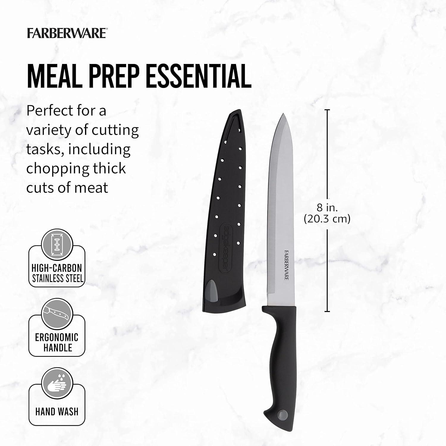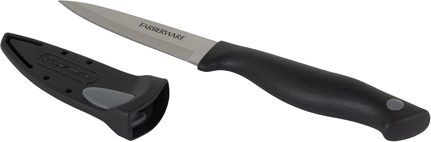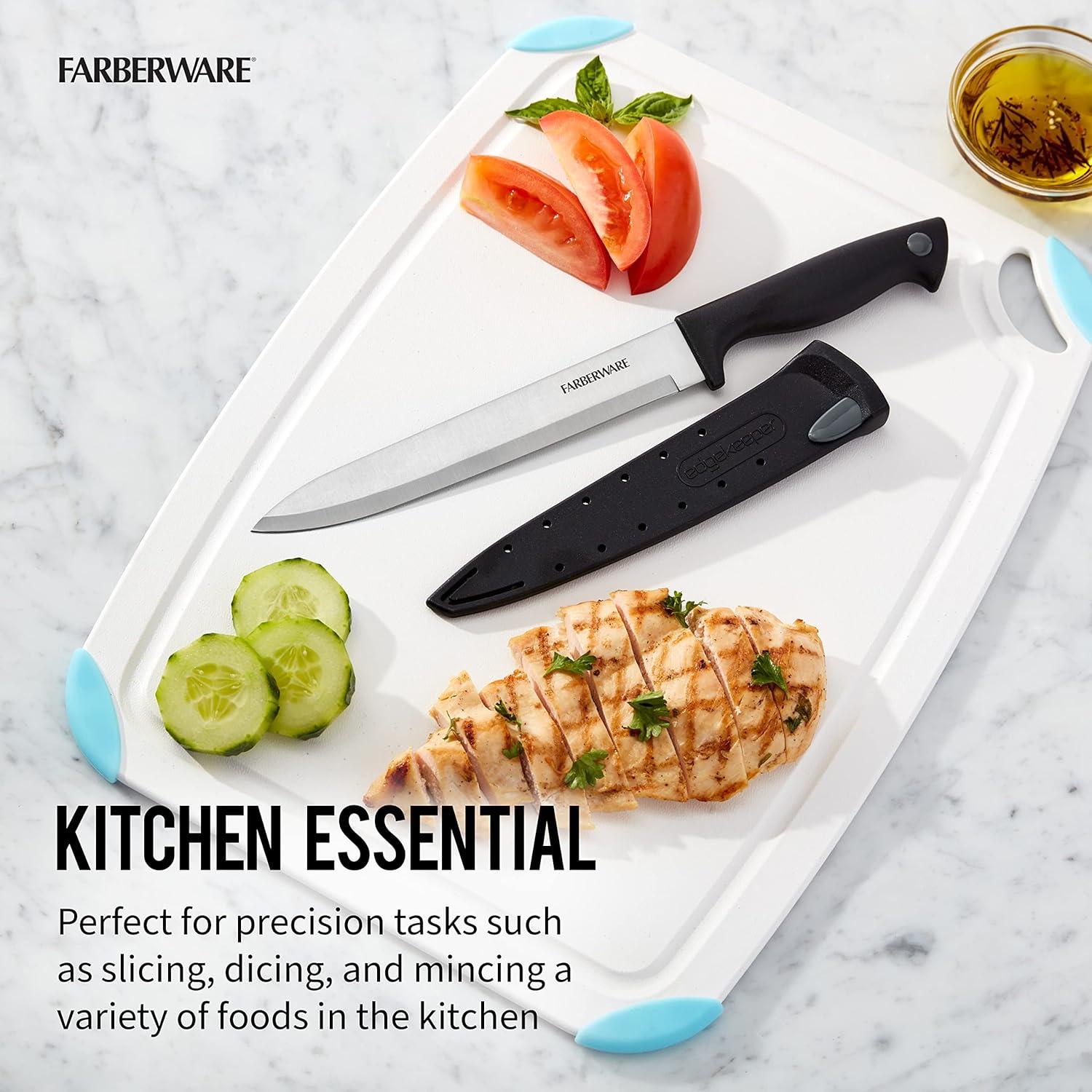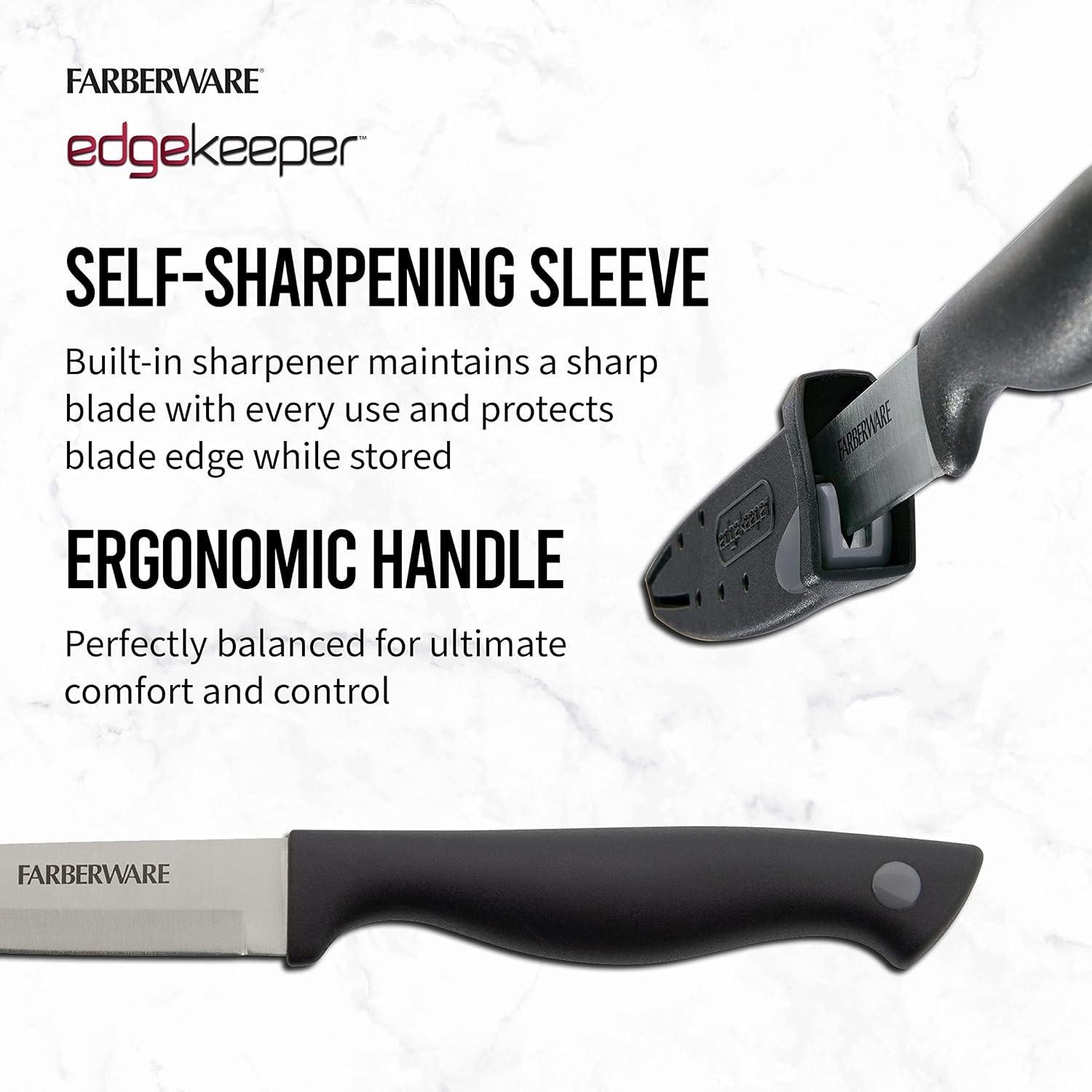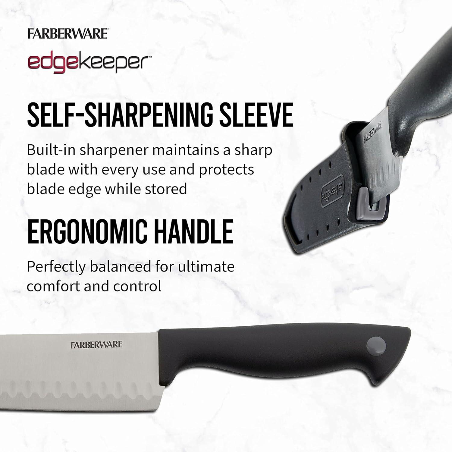 This Farberware 8-inch Slicing Knife with self-sharpening blade cover is essential for your everyday food prep tasks. It features a high-carbon stainless steel blade that cuts with higher precision. The ergonomically designed polypropylene handle is comfortable and balanced for precise cutting tasks. The Edgekeeper blade cover features a built-in sharpener designed to sharpen blade edges with every use. To Use: Hold the bottom of the sharpening sleeve and gently remove the knife with opposite hand. Blade edge will sharpen as knife is removed from the sleeve, as well as inserted into the sleeve. Includes: 8-inch slicing knife with self-sharpening blade cover. Hand wash with warm water and a mild detergent; rinse and dry immediately; wipe protective, blade cover as needed with a damp cloth.