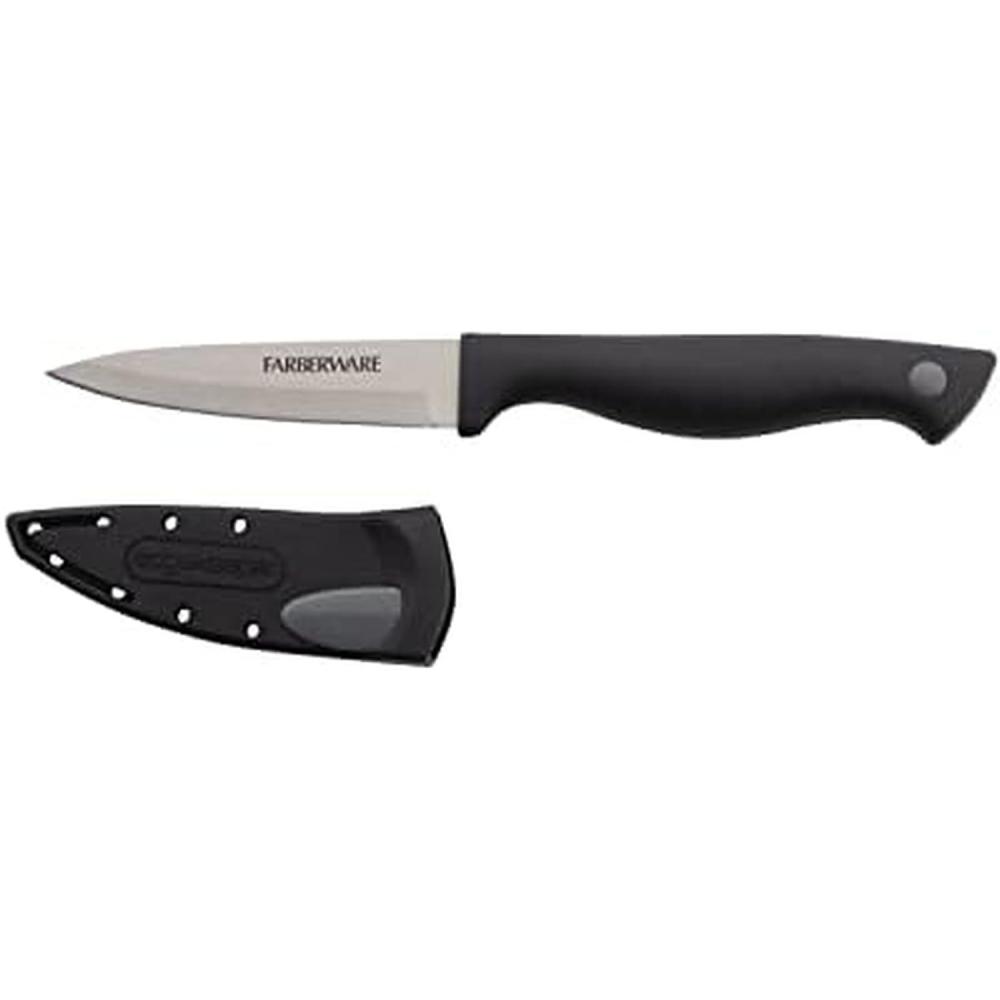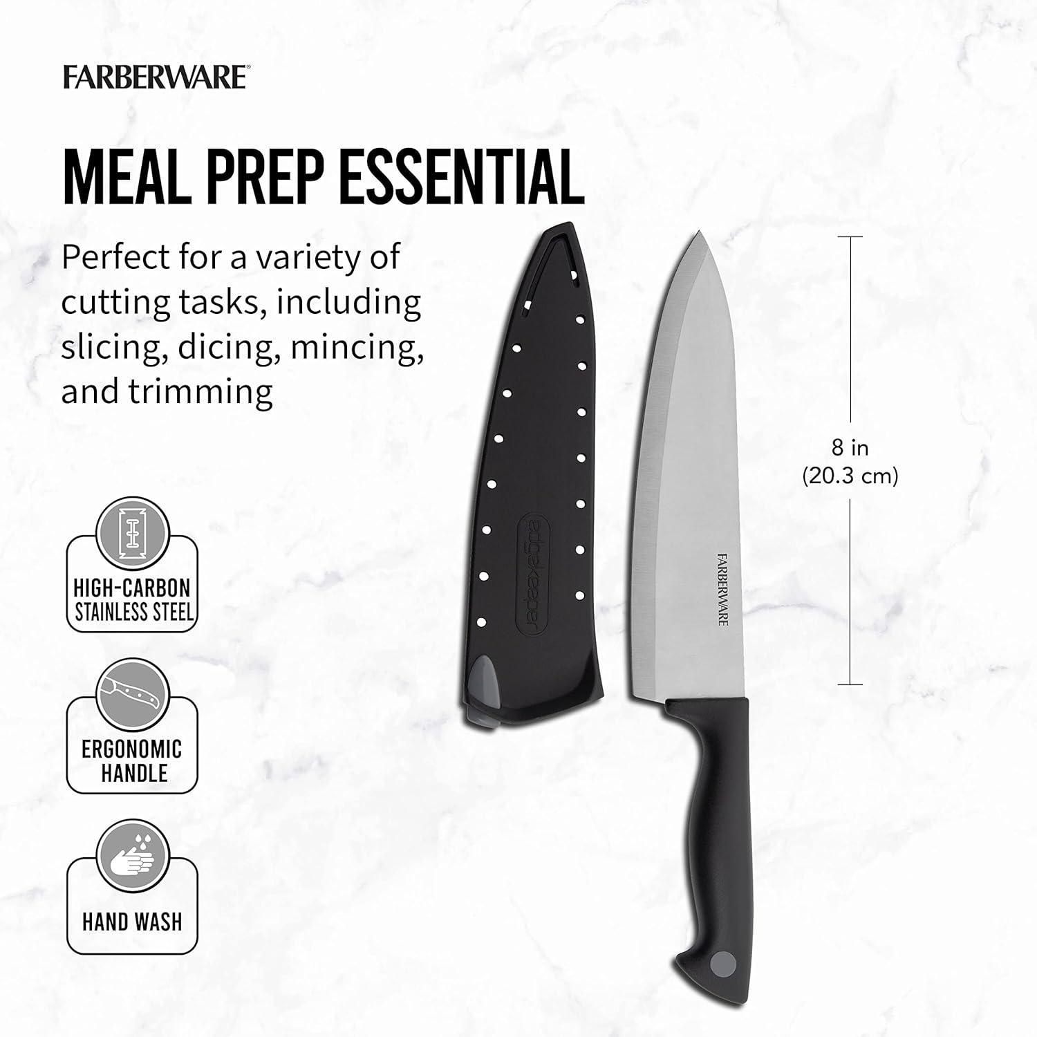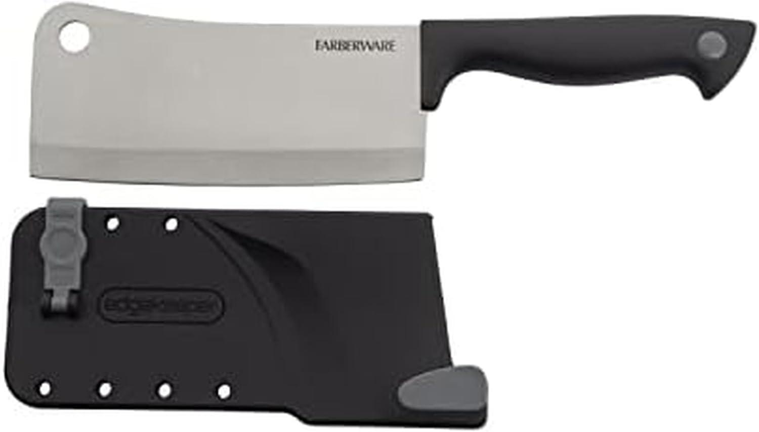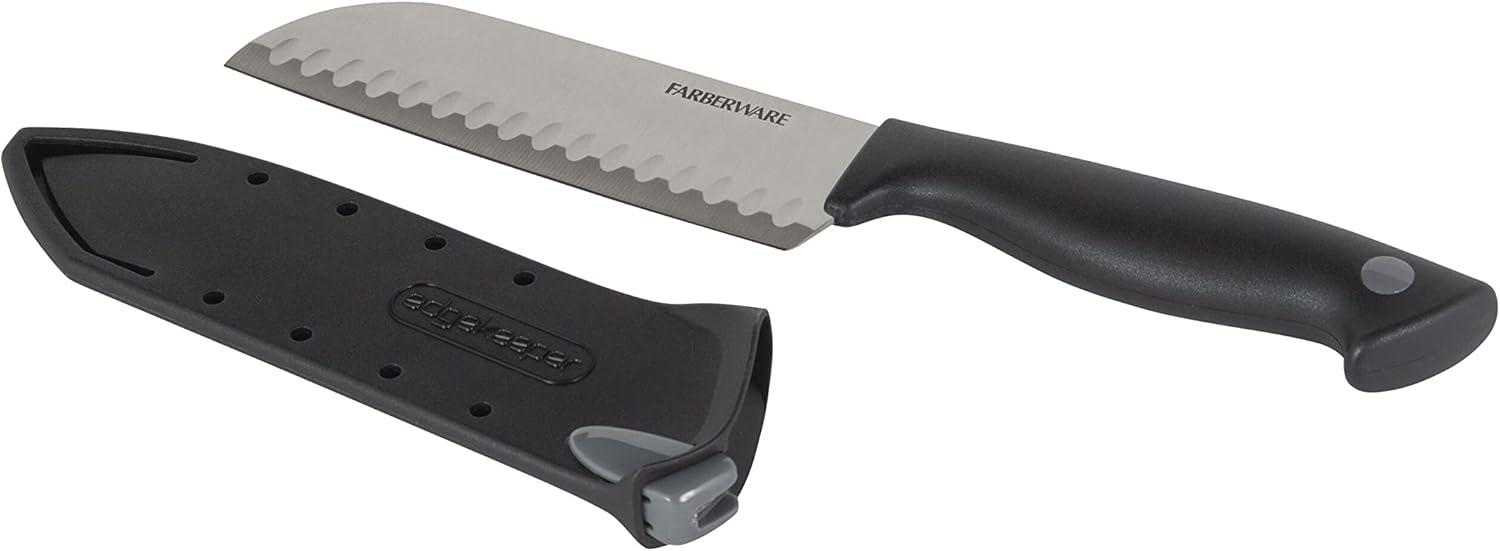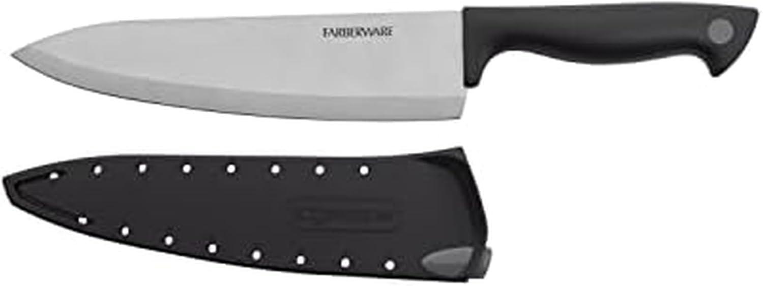 This Farberware 8-inch Slicing Knife with self-sharpening blade cover is essential for your everyday food prep tasks. It features a high-carbon stainless steel blade that cuts with higher precision. The ergonomically designed polypropylene handle is comfortable and balanced for precise cutting tasks. The Edgekeeper blade cover features a built-in sharpener designed to sharpen blade edges with every use. To Use: Hold the bottom of the sharpening sleeve and gently remove the knife with opposite hand. Blade edge will sharpen as knife is removed from the sleeve, as well as inserted into the sleeve. Includes: 8-inch slicing knife with self-sharpening blade cover. Hand wash with warm water and a mild detergent; rinse and dry immediately; wipe protective, blade cover as needed with a damp cloth.