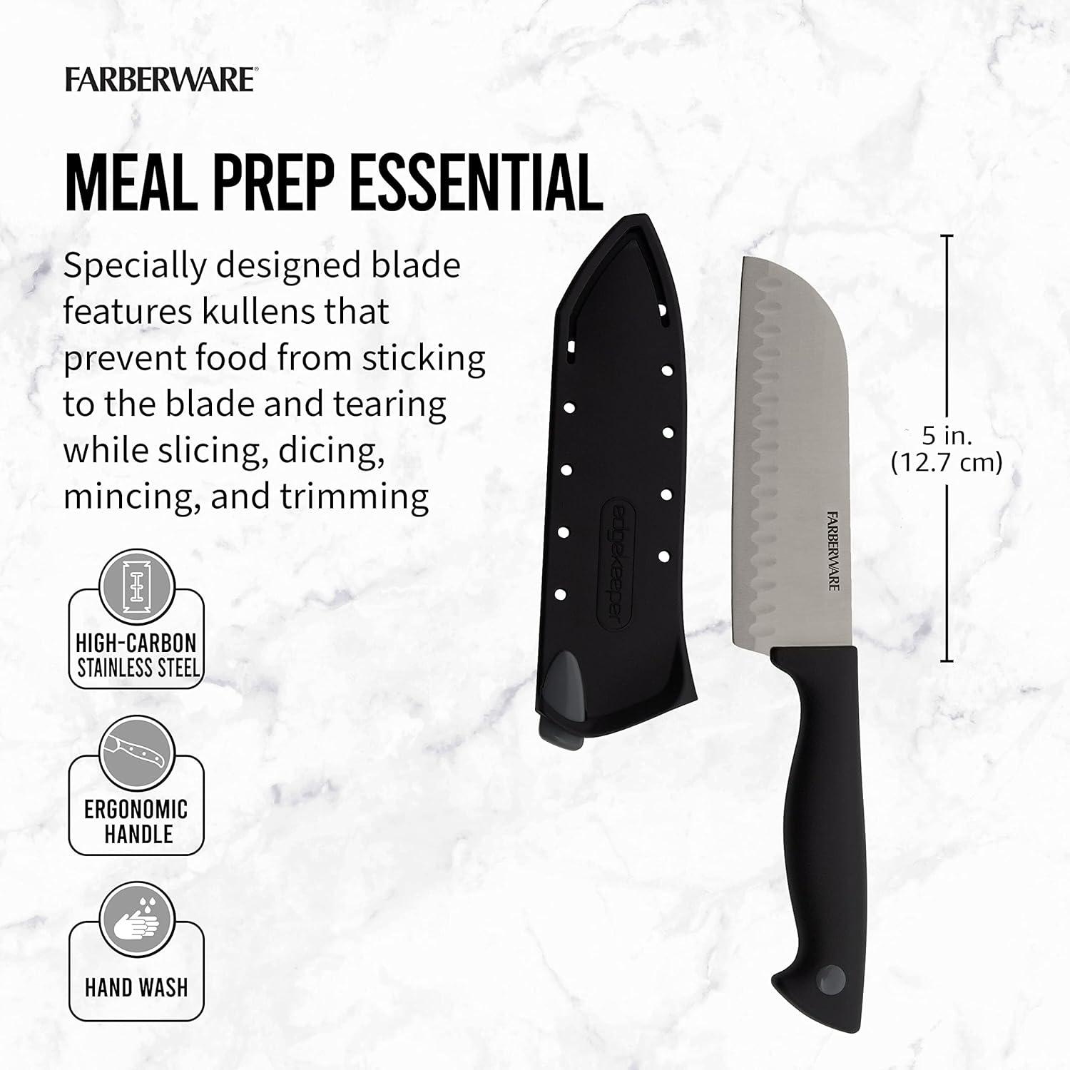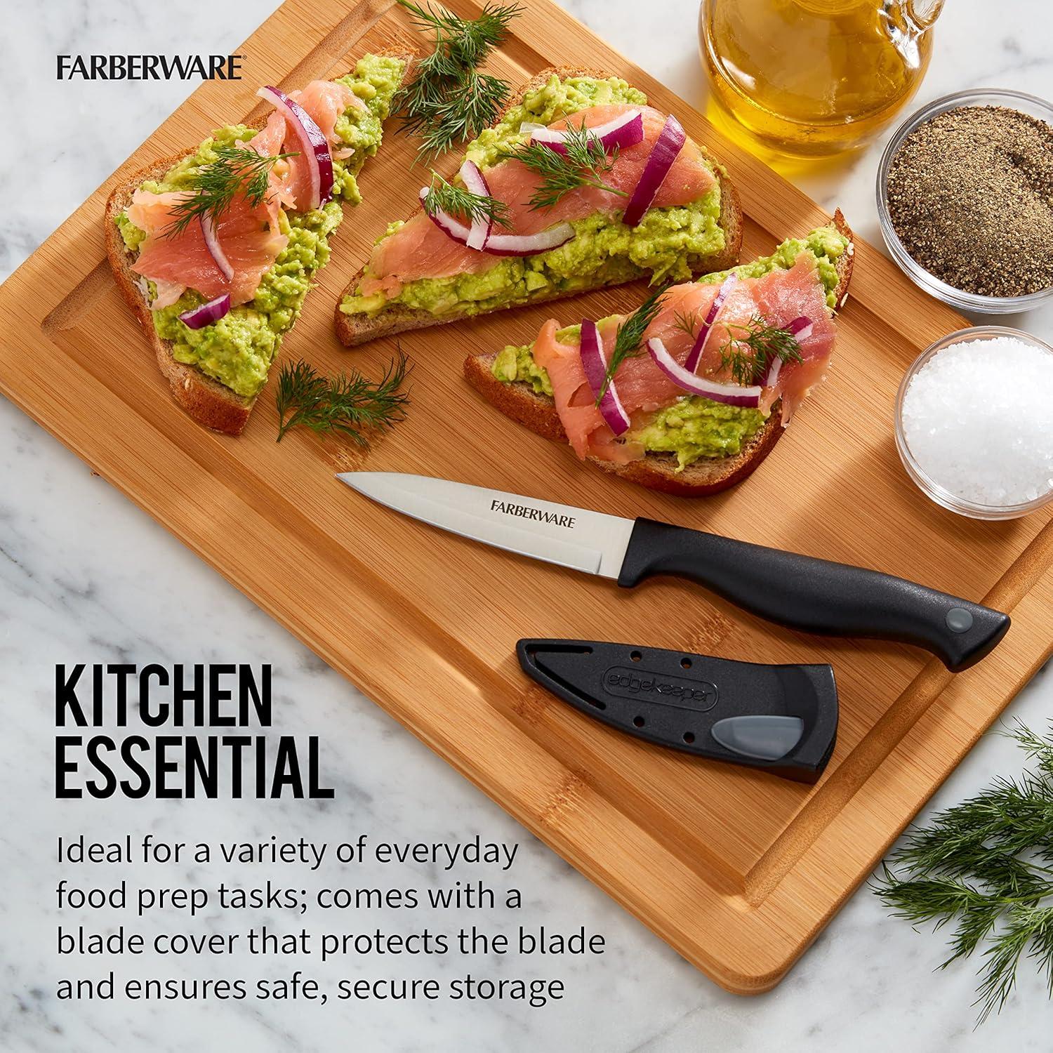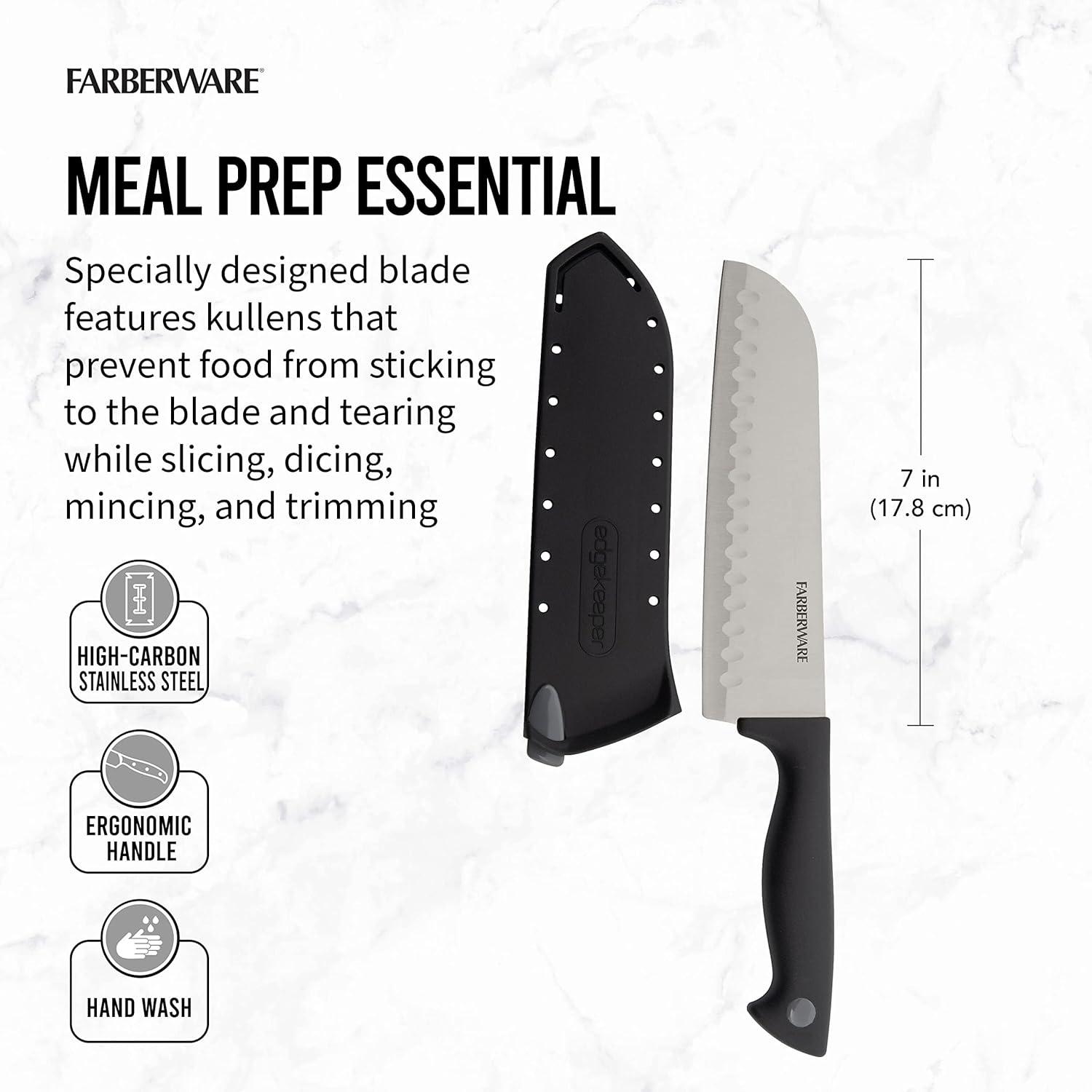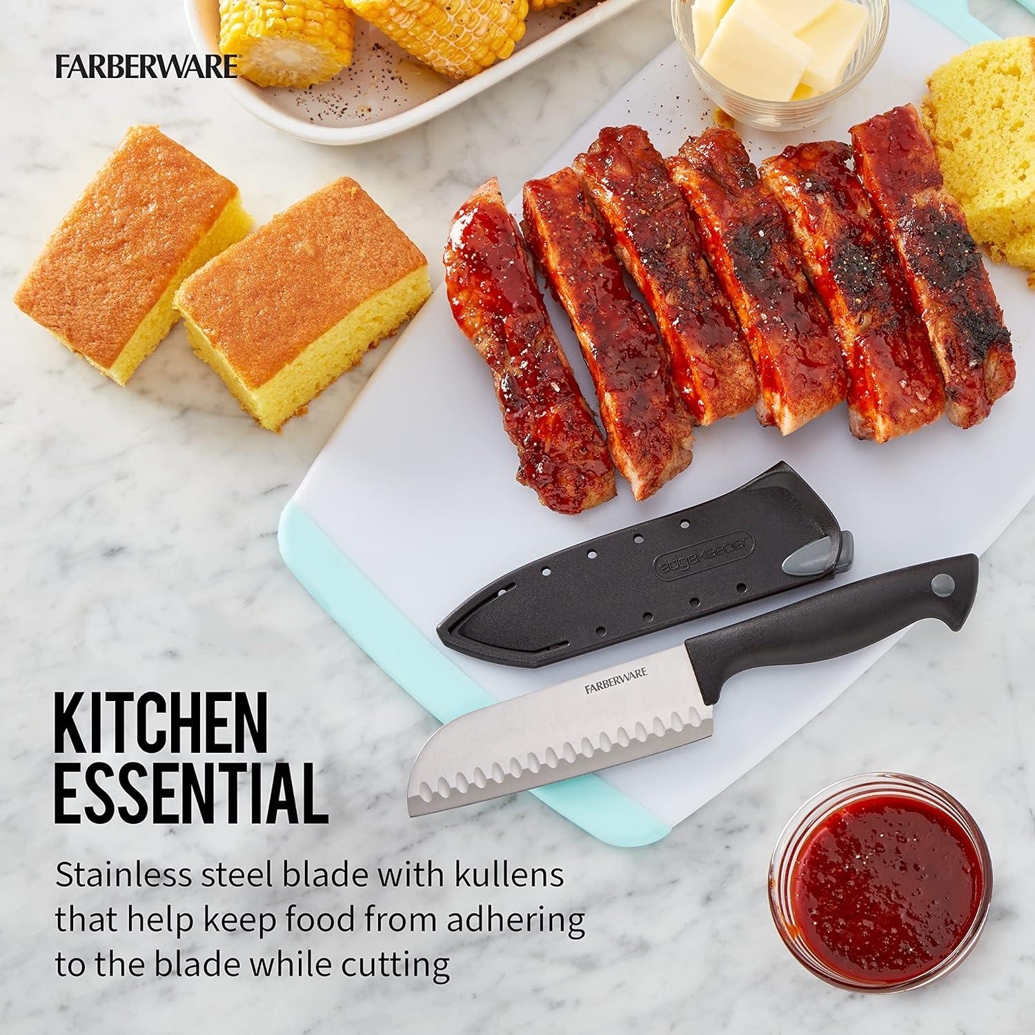 This Farberware 8-inch Slicing Knife with self-sharpening blade cover is essential for your everyday food prep tasks. It features a high-carbon stainless steel blade that cuts with higher precision. The ergonomically designed polypropylene handle is comfortable and balanced for precise cutting tasks. The Edgekeeper blade cover features a built-in sharpener designed to sharpen blade edges with every use. To Use: Hold the bottom of the sharpening sleeve and gently remove the knife with opposite hand. Blade edge will sharpen as knife is removed from the sleeve, as well as inserted into the sleeve. Includes: 8-inch slicing knife with self-sharpening blade cover. Hand wash with warm water and a mild detergent; rinse and dry immediately; wipe protective, blade cover as needed with a damp cloth.
