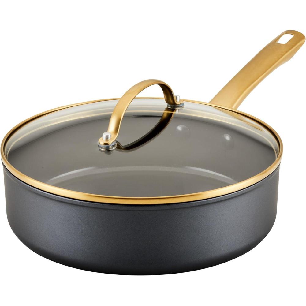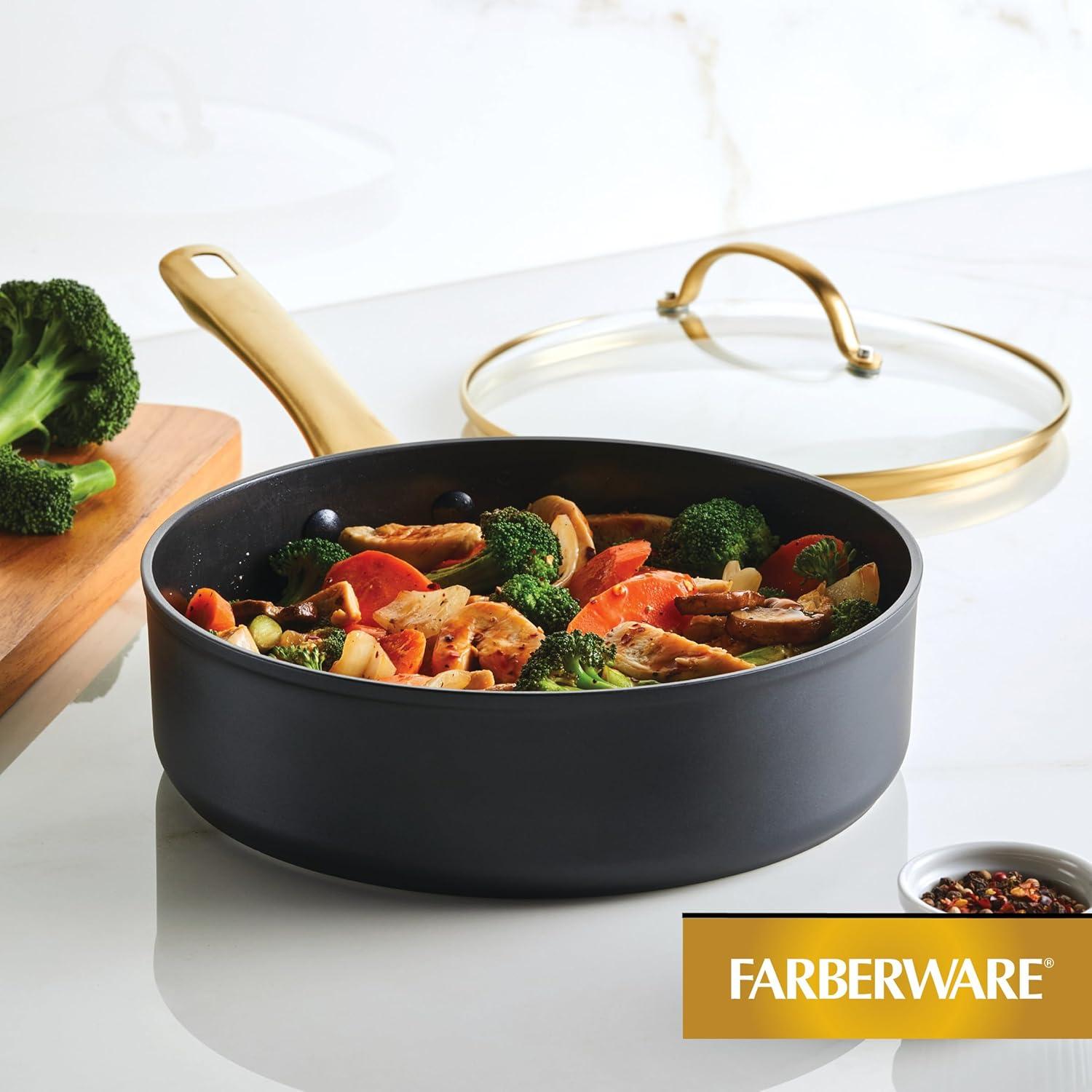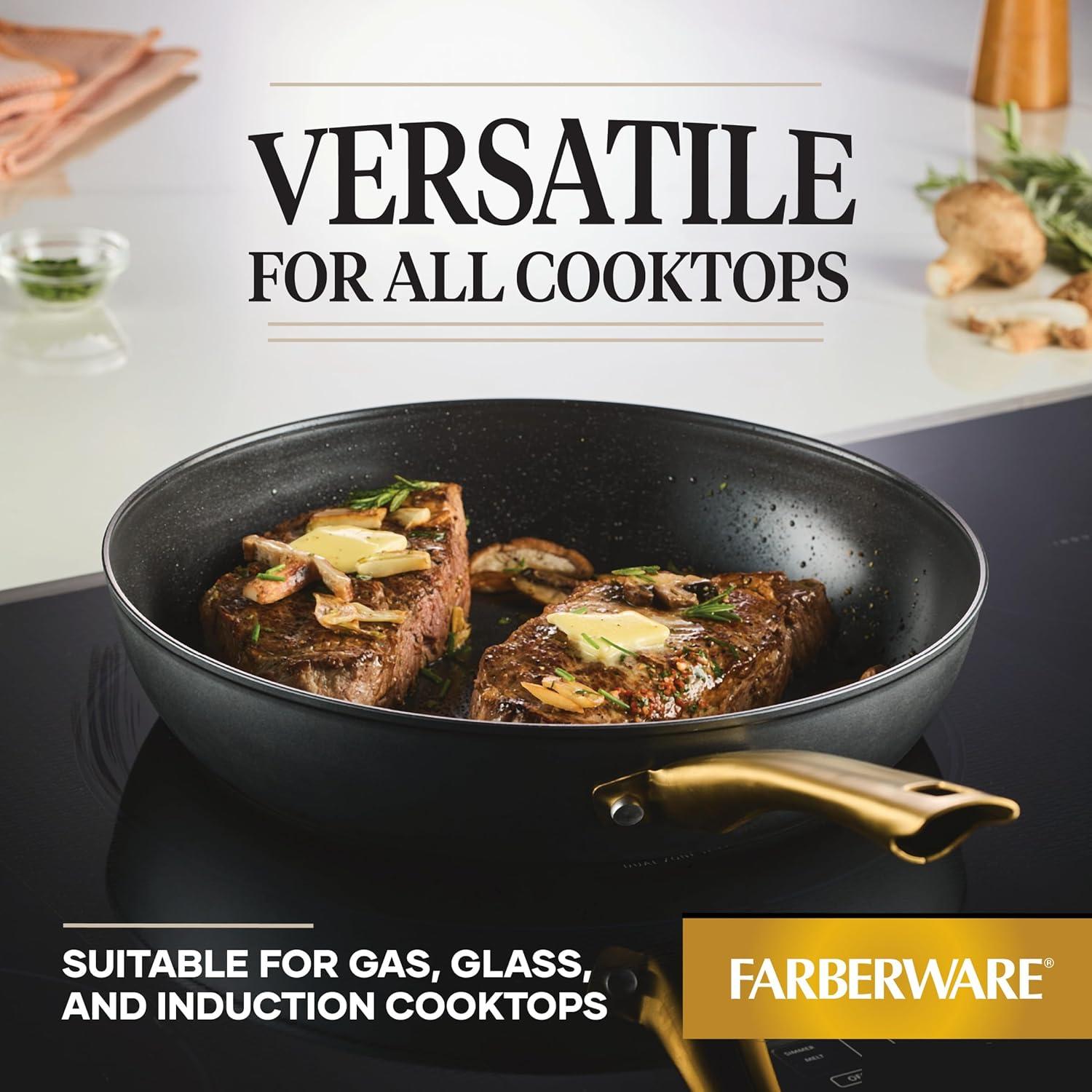 Farberware’s Forged Induction collection combines high-performance ceramic nonstick with a beautiful design that looks good on any stovetop, including induction. Forged Induction features ceramic nonstick surfaces – made without PFAS, PFOA, lead, or cadmium* – so you can cook with confidence; plus, forged-aluminum construction for superior heat distribution, and edge-to-edge steel bases for enhanced durability. Plus, this 10-inch frying pan stands out in any kitchen or on any dining table with a matte-black exterior and elegant gold-colored accents. *Product design does not involve intentionally adding to the interior nonstick coating any of these substances which may otherwise be present in the environment.