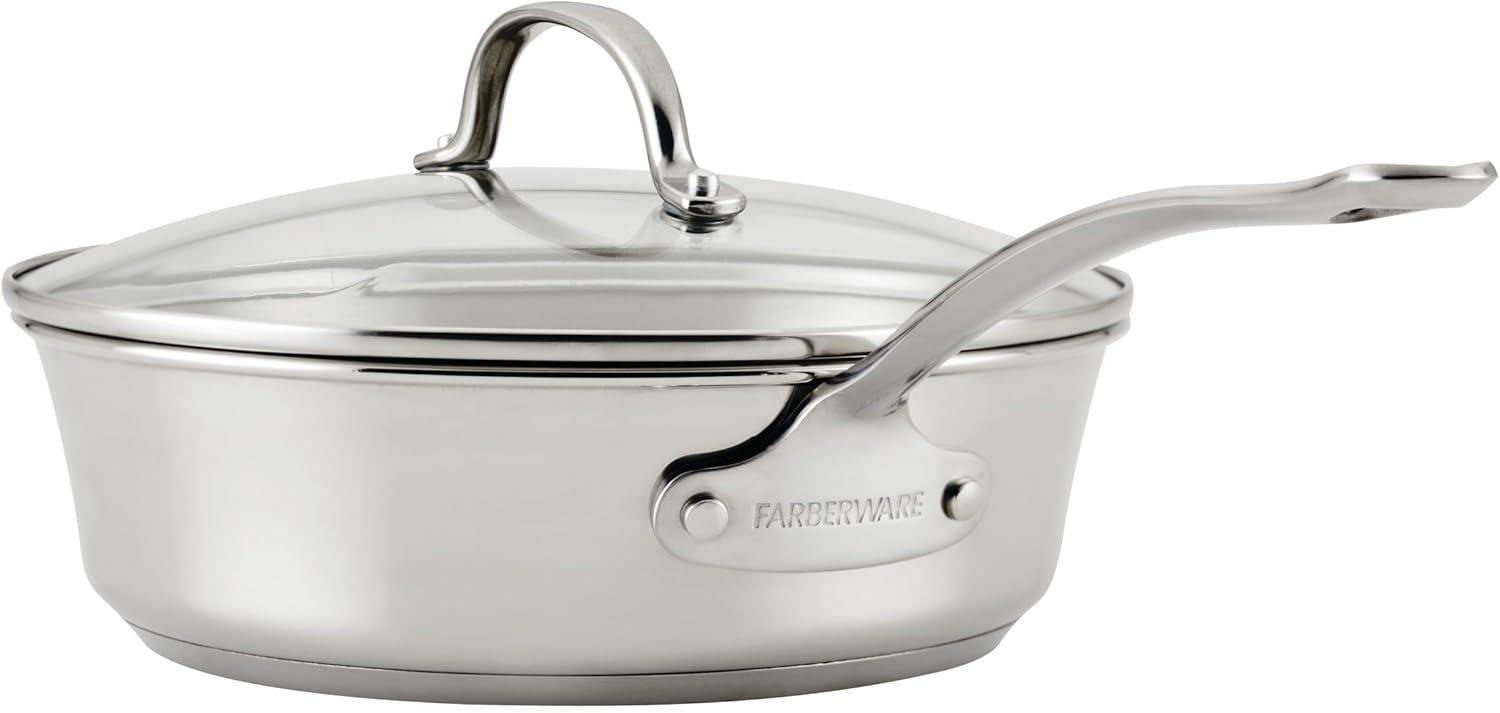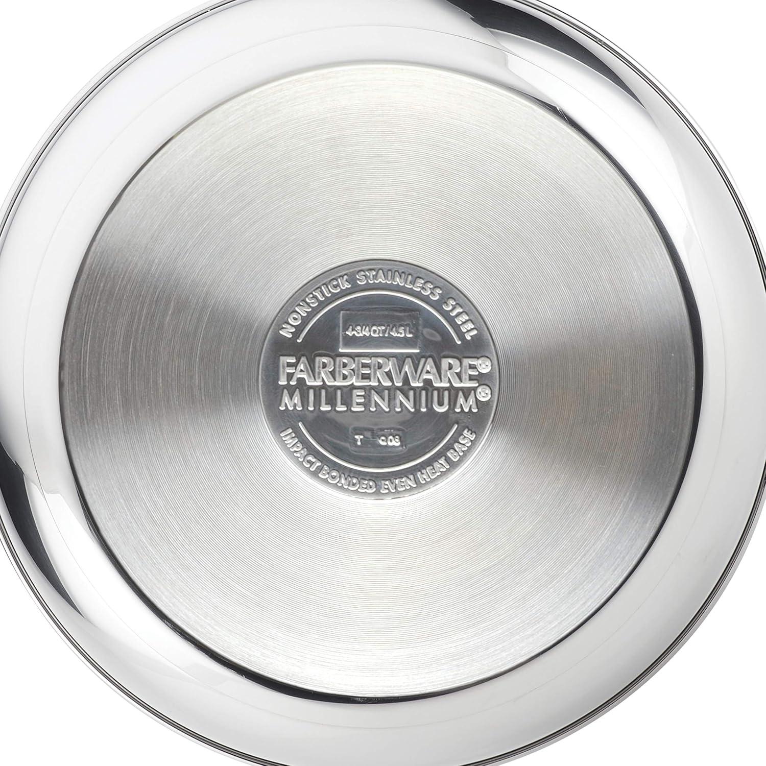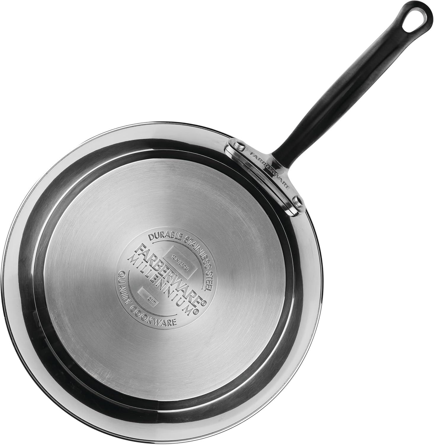 The Farberware Millennium 10-Piece Stainless Steel Cookware Set gives you an excellent value by including the basic pans needed to equip your kitchen. Farberware has brought performance, convenience and reliability to countless kitchens for over a century, and this cookware set continues that tradition for a new generation. Professionally styled polished stainless steel construction with gentle tulip shaped bodies looks great and is extremely durable. The stainless steel bases fully encapsulate a thick aluminum core to provide exceptional heat distribution, are compatible for use on all stovetops including glass and induction, and are oven safe to 500°F. Plus, the pots and pans are dishwasher safe for convenient, easy cleanup. Get classic design and modern convenience and value with the Farberware Millennium Stainless Steel 10-Piece Cookware Set.
