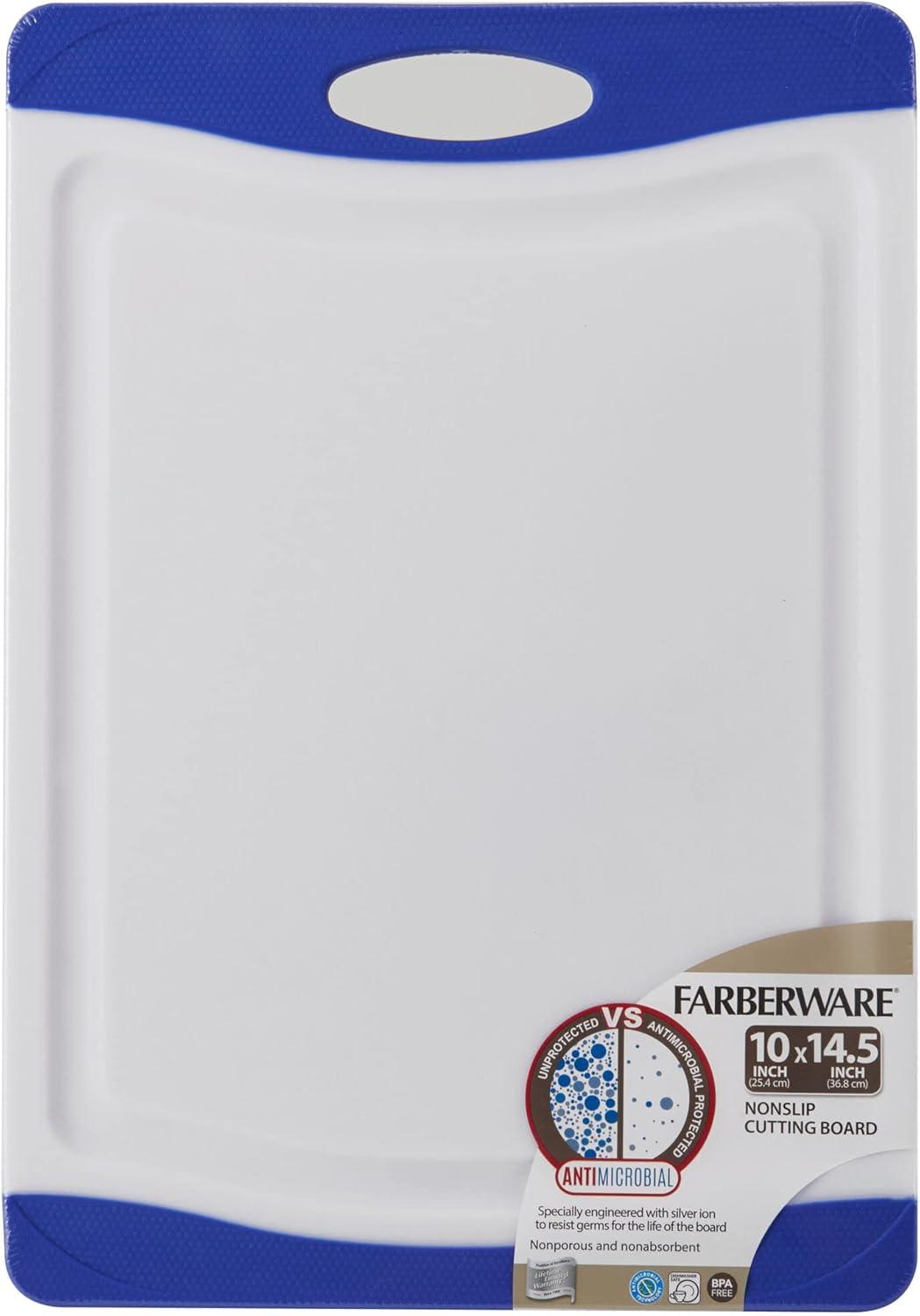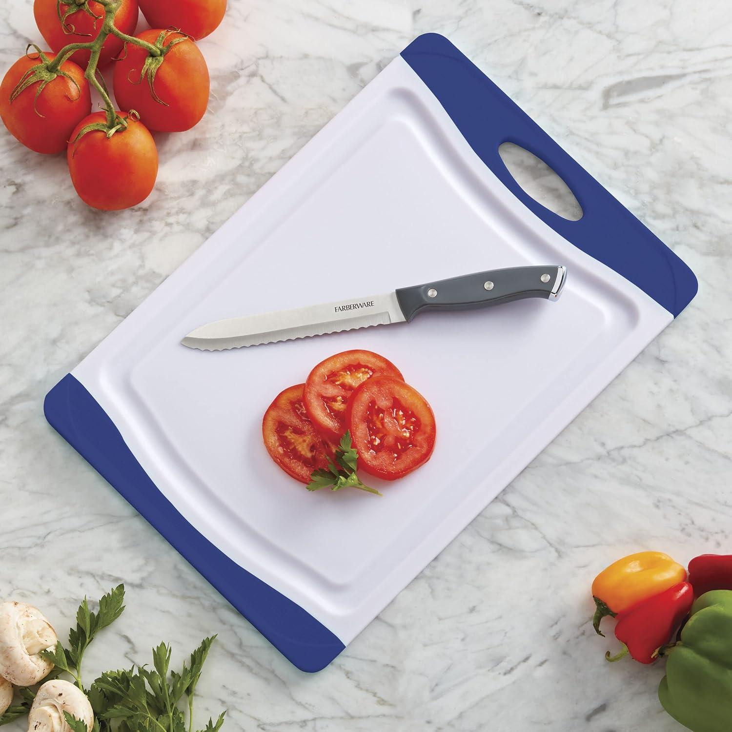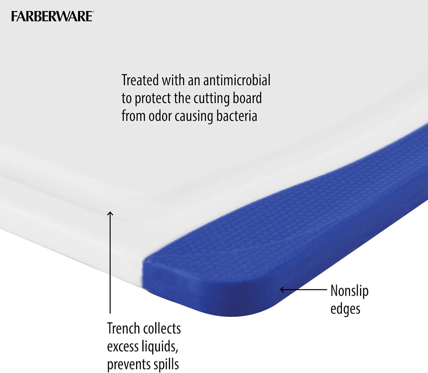 This Farberware 8 x 10 Inch White Cutting Board with grey trim is ideal for tackling everyday food prep tasks. Made of polypropylene plastic, it is stain resistant and nonabsorbent, so it won't retain odors. It is also gentle on blades so it won't dull knives, and reversible to double the cutting surface and help prevent cross-contamination. Drainage grooves frame the board to catch juices and cut down on messes, and the board has nonslip santoprene edges that provide stability on countertops while in use. Dishwasher safe.