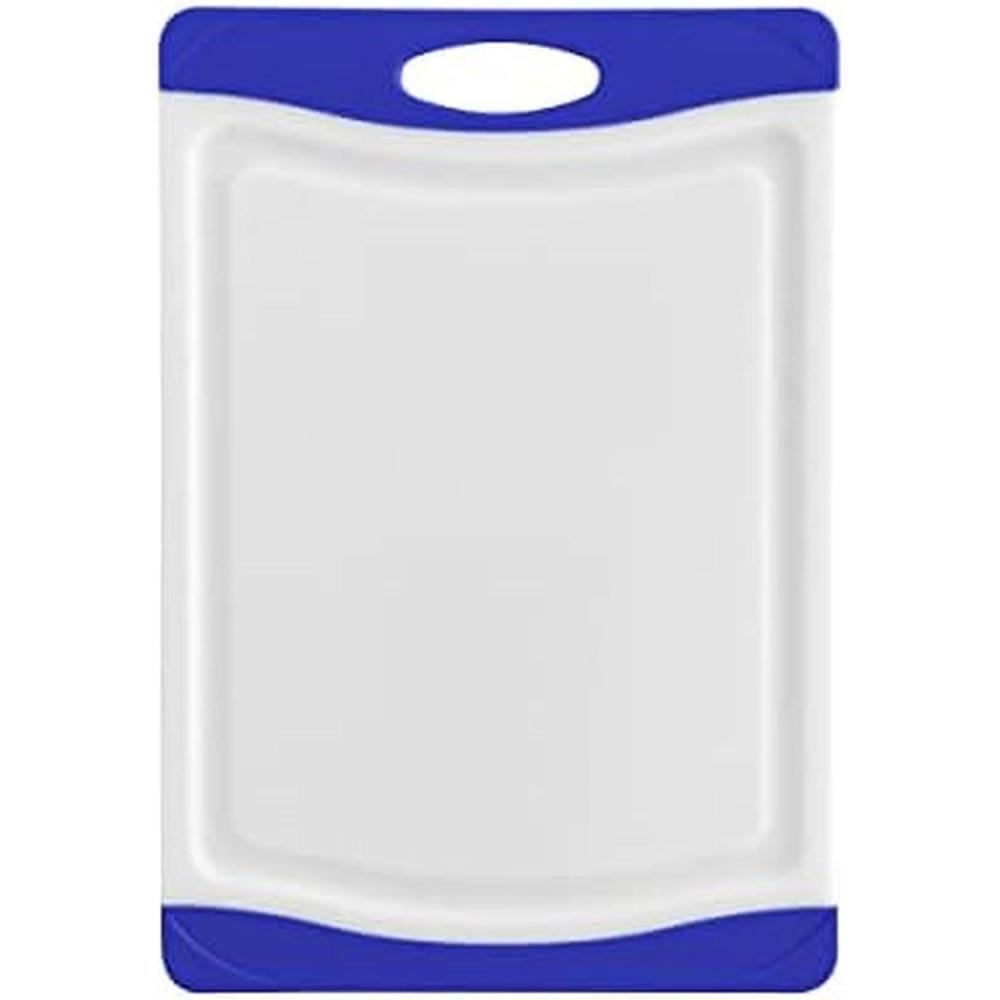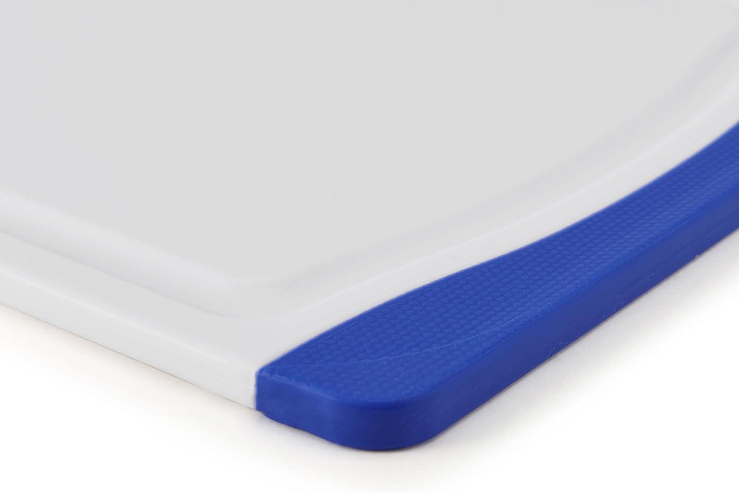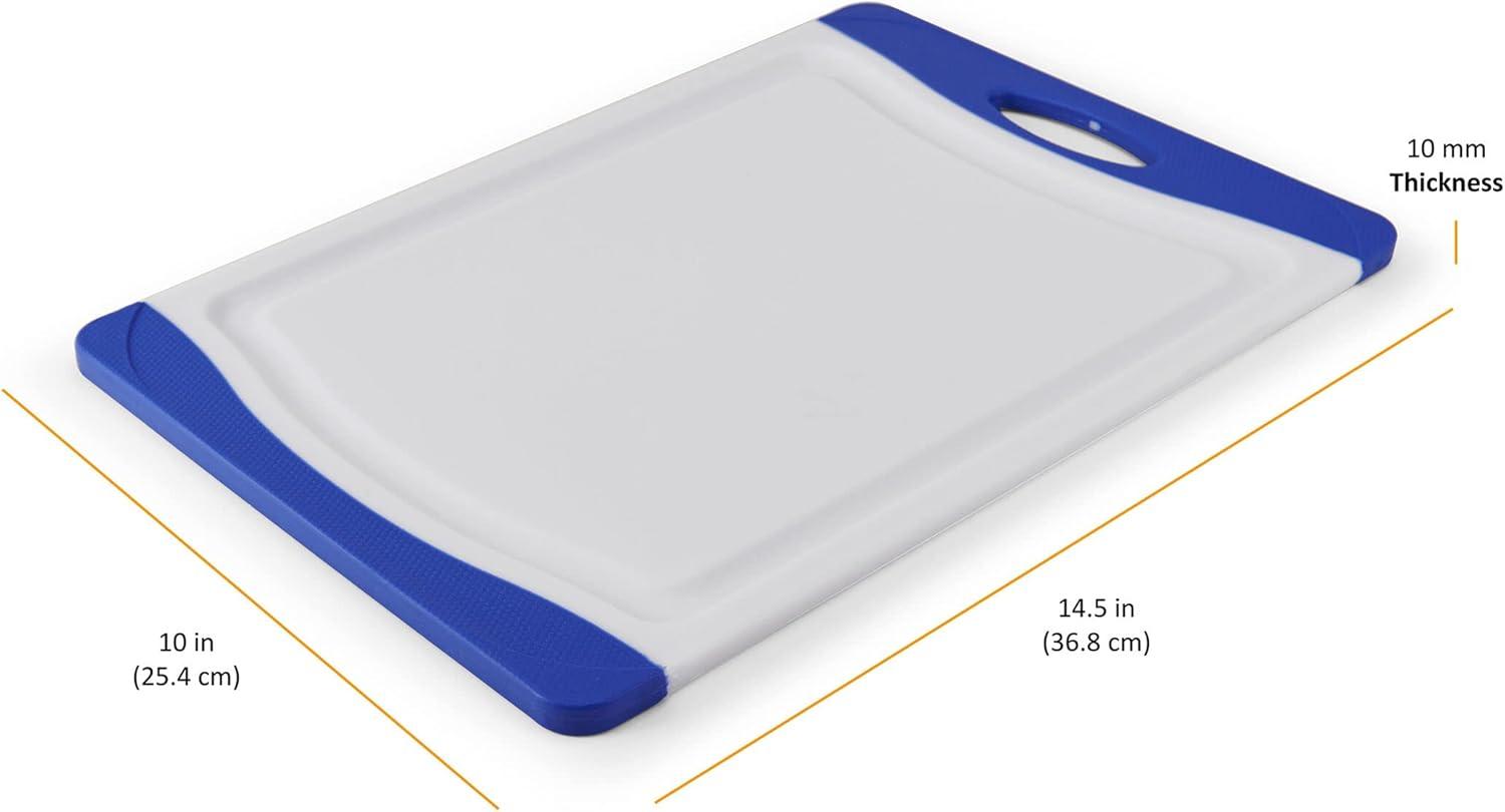 This Farberware 8 x 10 Inch White Cutting Board with grey trim is ideal for tackling everyday food prep tasks. Made of polypropylene plastic, it is stain resistant and nonabsorbent, so it won't retain odors. It is also gentle on blades so it won't dull knives, and reversible to double the cutting surface and help prevent cross-contamination. Drainage grooves frame the board to catch juices and cut down on messes, and the board has nonslip santoprene edges that provide stability on countertops while in use. Dishwasher safe.