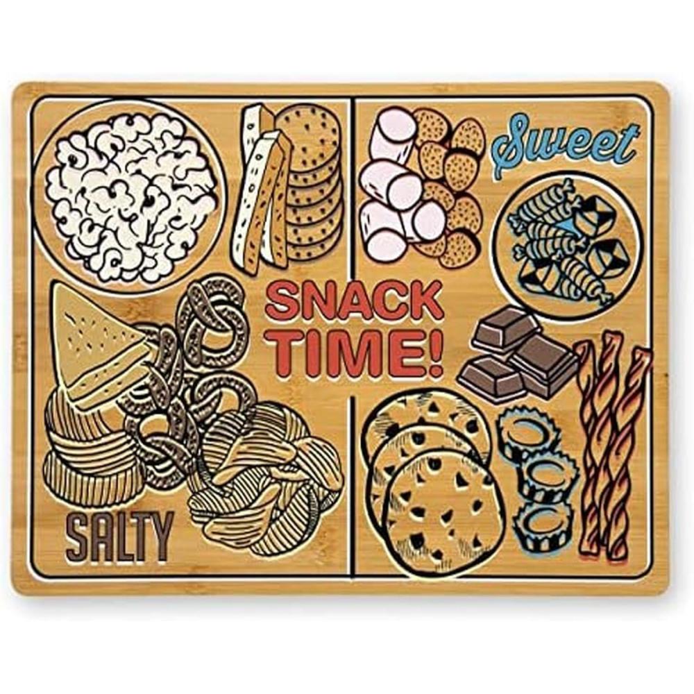 ENTERTAINING ESSENTIAL: A perfect platform for serving sweet and salty snacks, and more, with food arrangement suggestions printed right on the board.