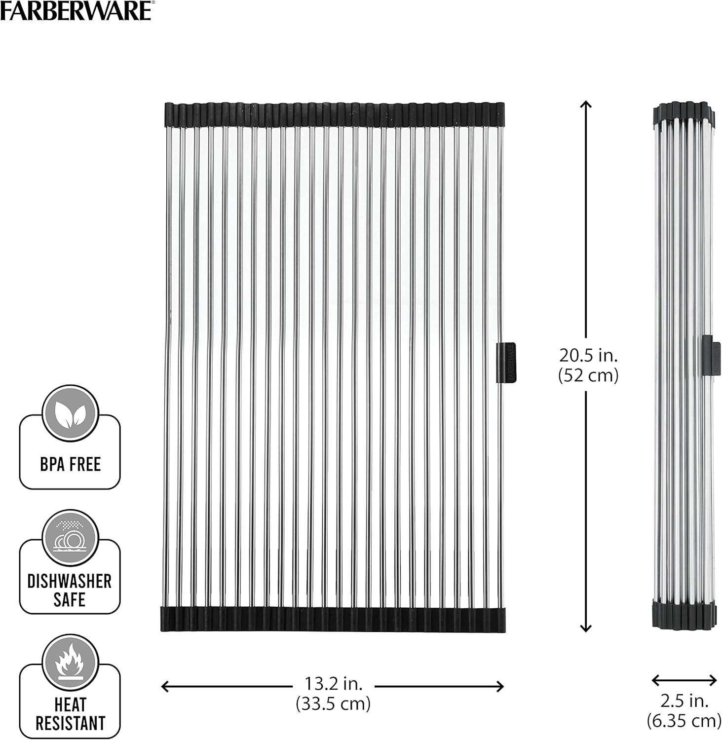 Farberware Space Saving Roll Up Over The Sink Dish Drying Mat with Rust Resistant Stainless Steel Wires with Non Slip BPA Free Food Safe Caps, Large, Silver/Black