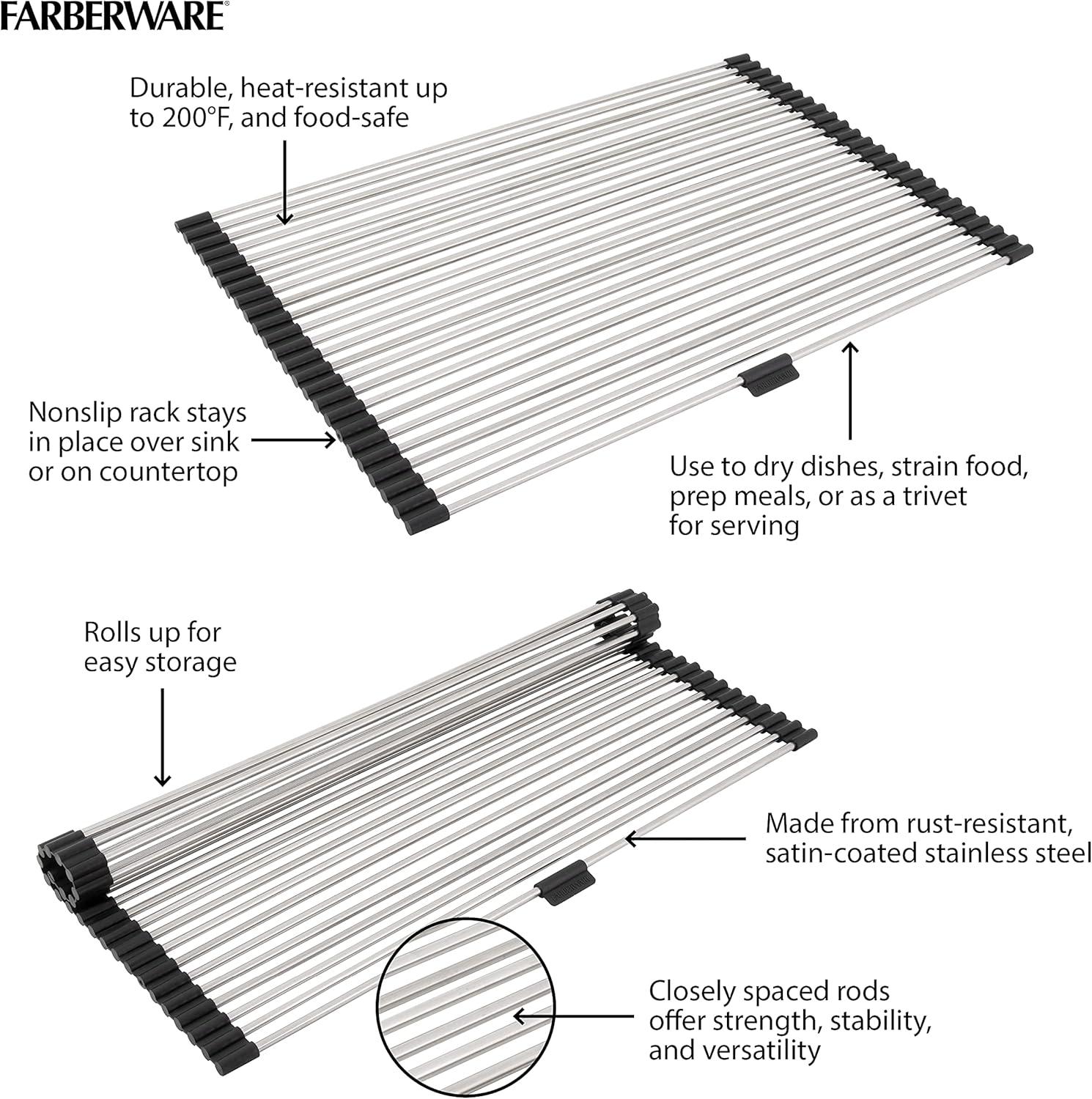 This Farberware Rolling Drying Rack unrolls over the sink to maximize counter space and provide extra room for quickly drying dishware, flatware, and cookware. This versatile rack can also be used to rinse produce, or as a trivet to protect countertops from hot pots and pans. The long-lasting, rust-resistant, stainless steel rods with a satin finish withstand everyday use and are heat-resistant up to 200°F. The nonslip, food safe, BPA-free TPE end-caps keep the rack in place without scratching your countertops, while the open-wire construction promotes even airflow for quick and efficient drying. Wires are placed closely together for added stability and strength. Can hold up to 22 pounds. Rack folds or rolls-up to easily fit in drawers, cabinets, closets, and more. Measures 20.5 x 13.2 x 0.4 inches. Hand-wash only..