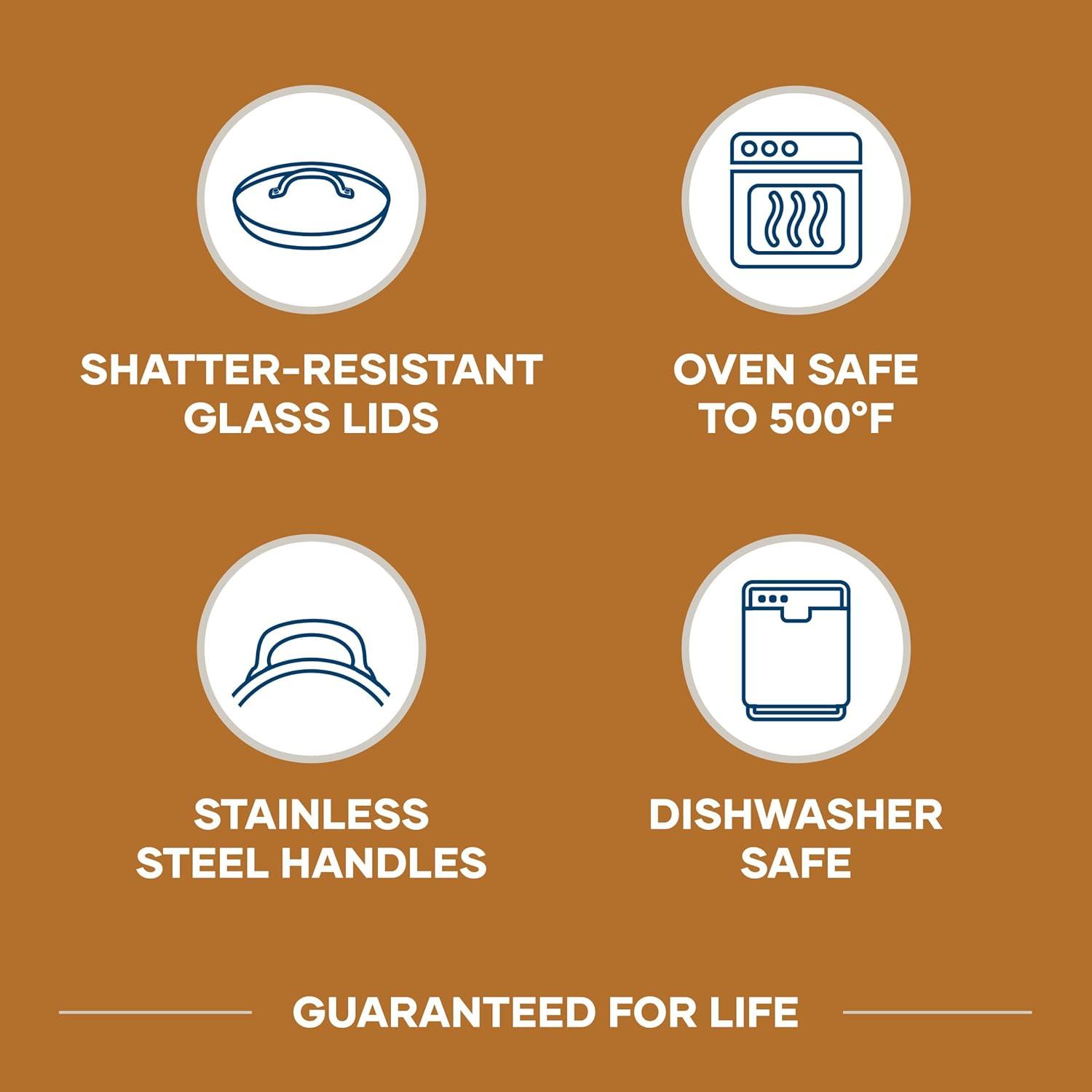 FAST AND EVEN HEATING: Durable aluminum cookware construction provides fast, even-heating pots and pans to get you in and out of the kitchen with consistently delicious results. Oven safe up to 500°F.